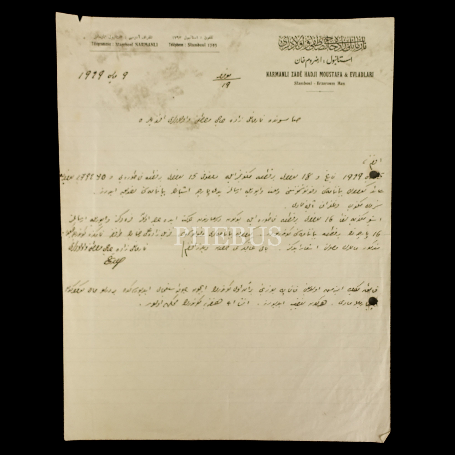 "Narmanlızade Hacı Mustafa ve Evlatları" antetli fatura, 9 Mayıs 1929, 21x27 cm...