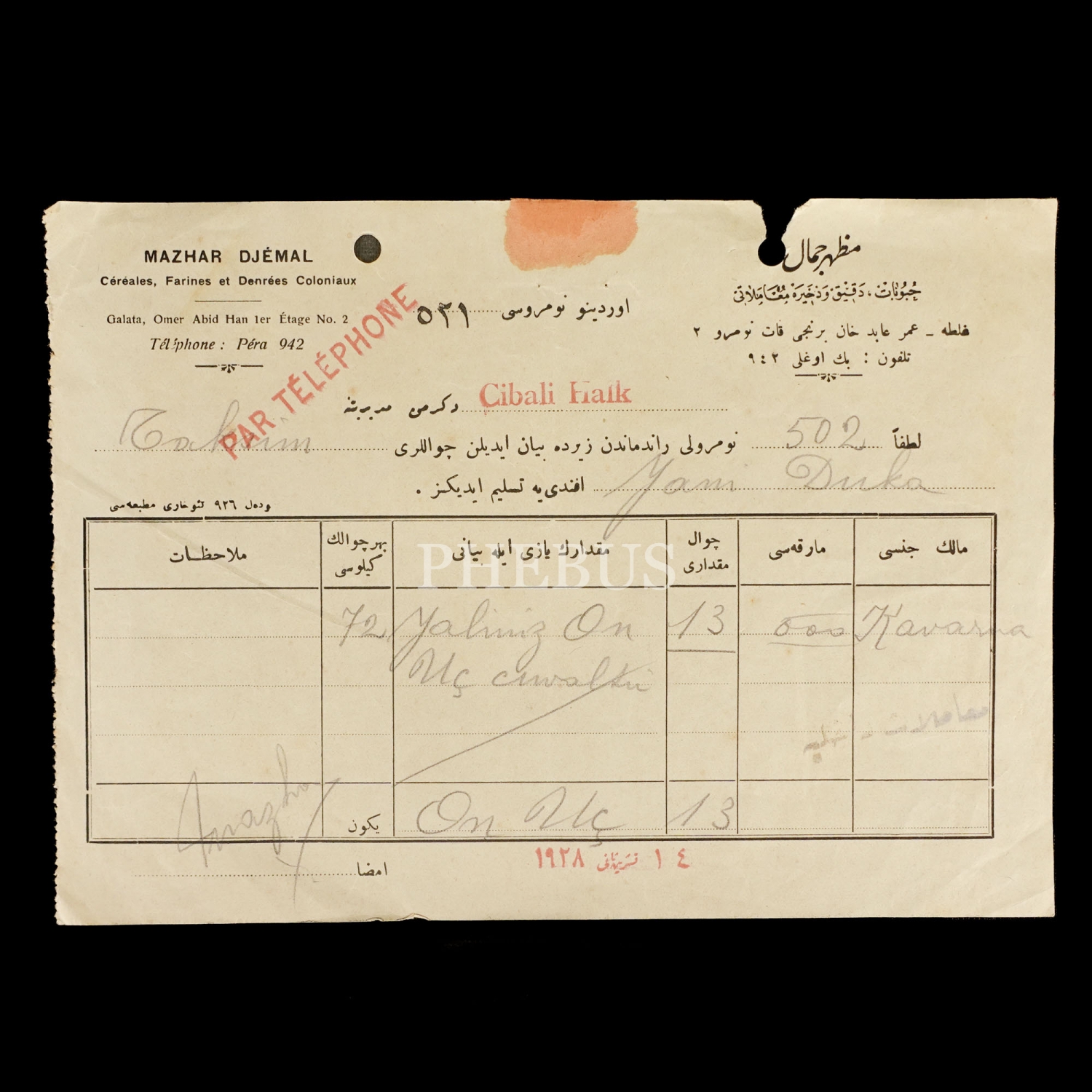 "Hububat, Dakayık ve Zahire Mamulatı Mazhar Cemal" antetli fatura, 14 Teşrinisani 1928, 20x15 cm...