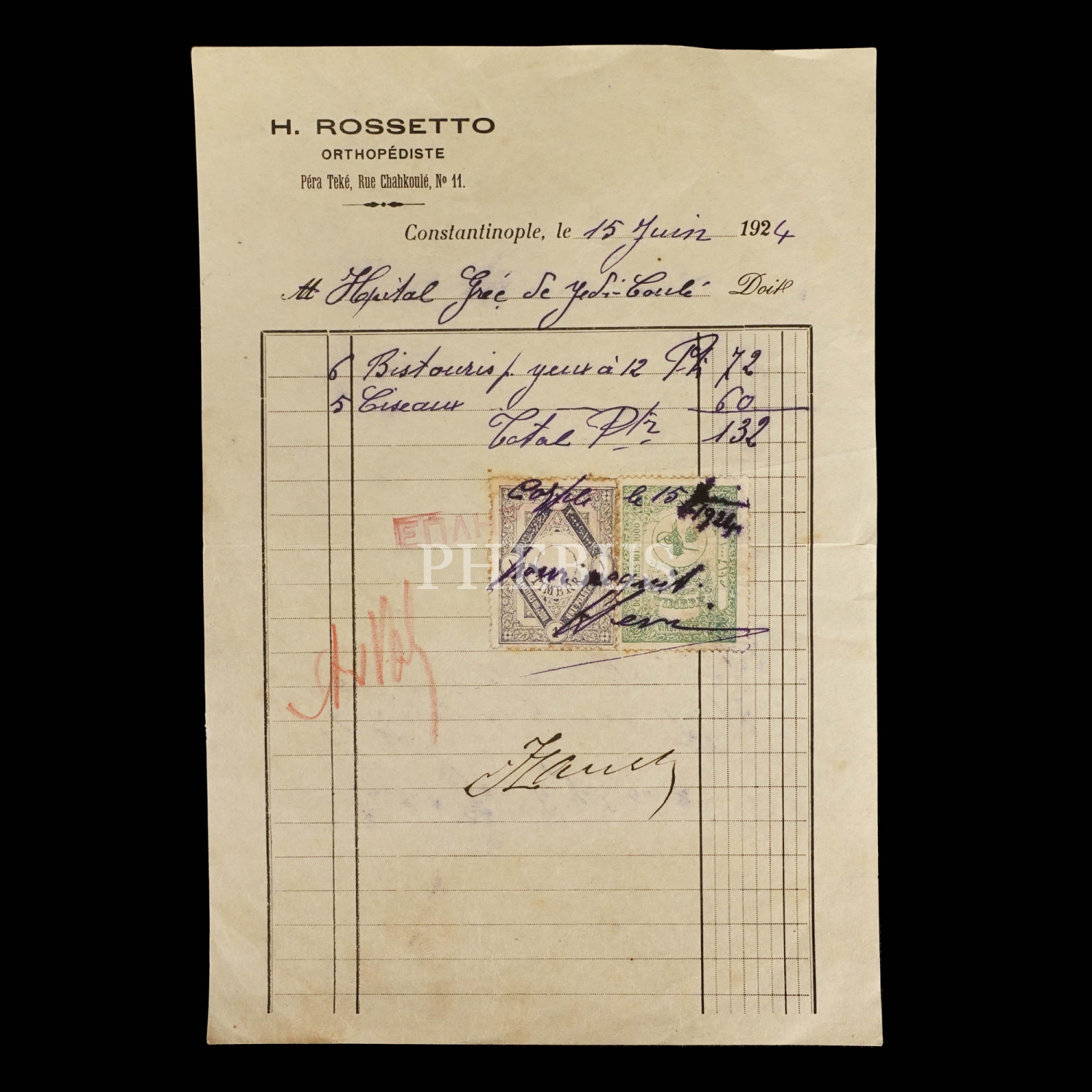"H. Rossetto (Orthopediste) - Constantinople" antetli fatura, 15 Haziran 1924, 15x22 cm...