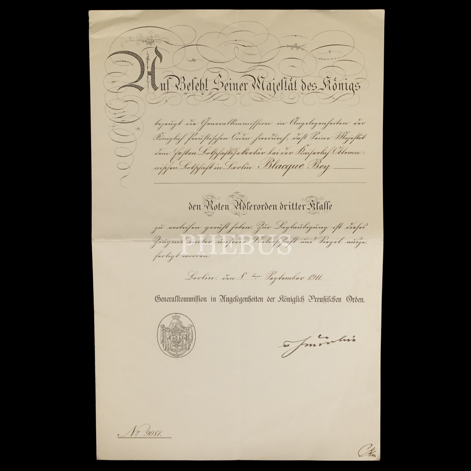 Prusya Kralı tarafından Blacque Bey´e verilen bir devlet nişanının beratı, 1911, 22x33 cm...