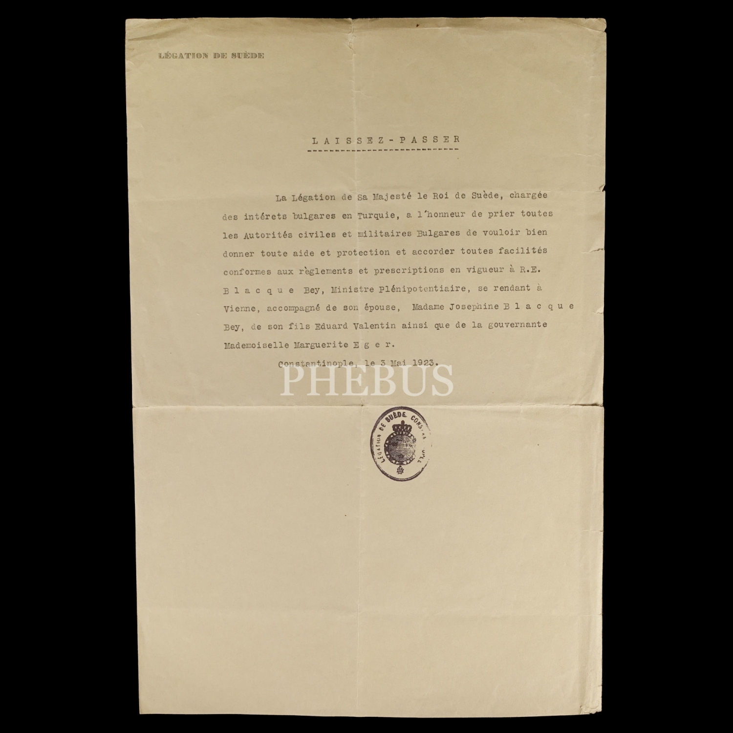 İsveç´in Osmanlı elçisinin, Bulgar sivil ve askeri makamlarından, Bulgaristan üzerinden Viyana´ya geçecek R. E. Blacque Bey ile ailesine kolaylık sağlamalarını rica ettiği daktilo mektup, 23x33 cm...