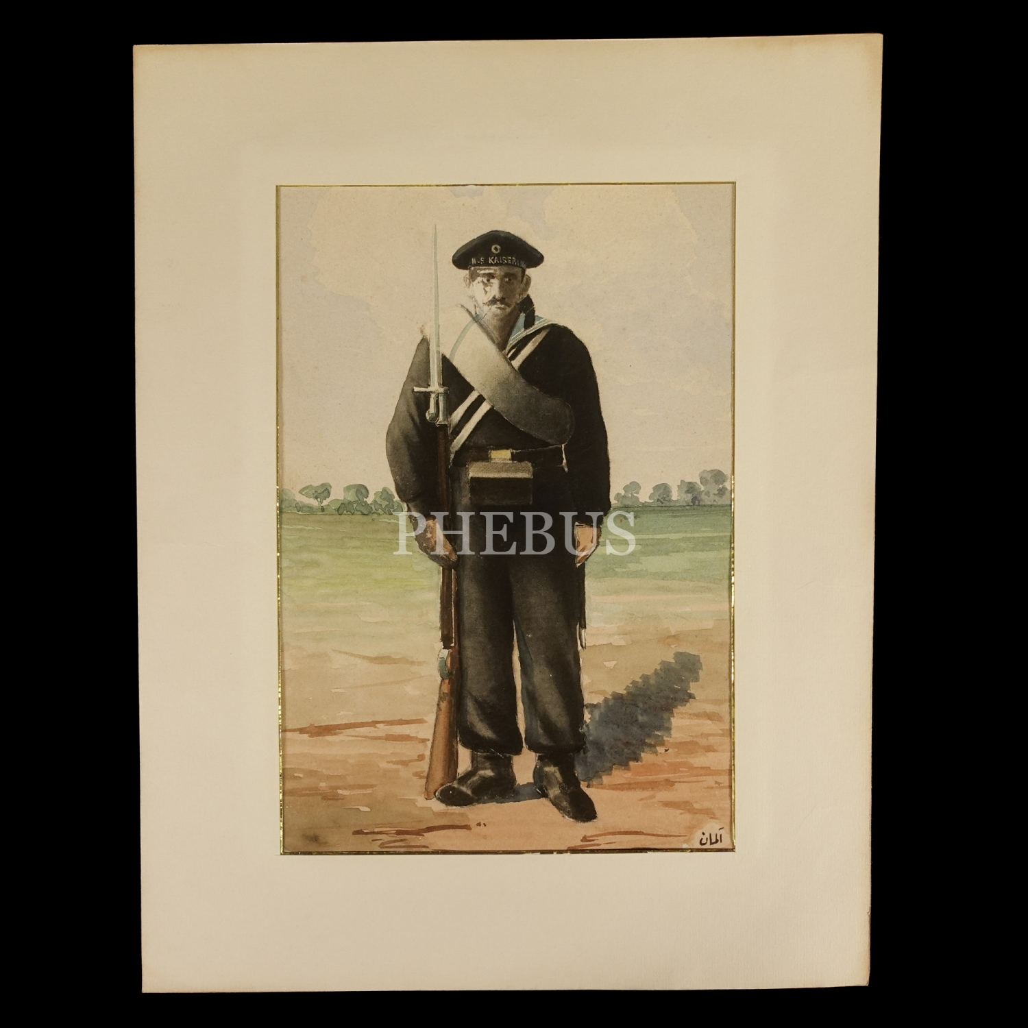 Bir Alman zırhlısında vazifeli, şapkası "M.S. Kaiserin.." ibareli denizcinin orijinal çizim resmi, karton üzeri sulu boya, paspartusuyla birlikte 26x34 cm...