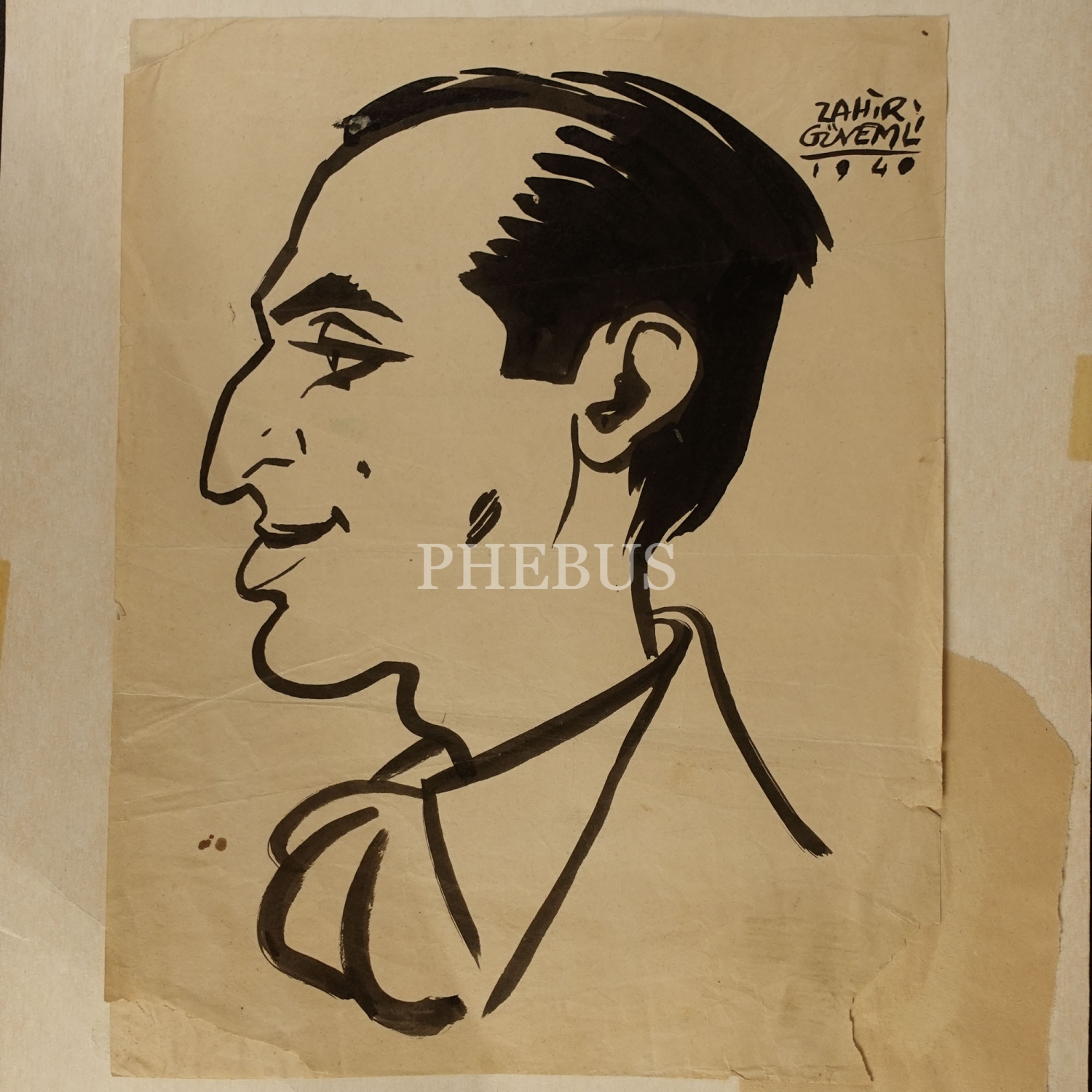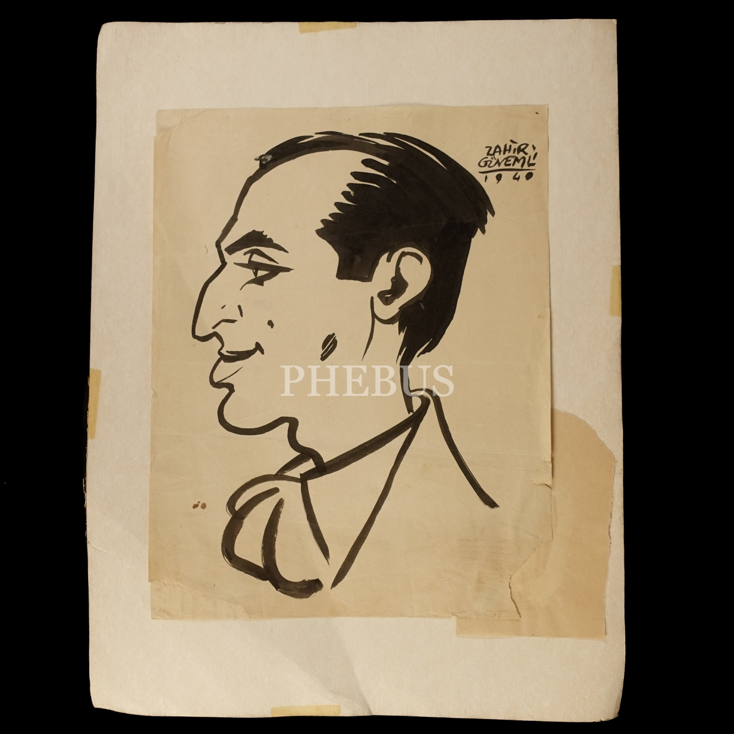 Zahir Güvemli´den ıslak imzalı, 1940 tarihli karikatür, kâğıt üzeri çini mürekkebi, paspartusuyla birlikte 31x40 cm...