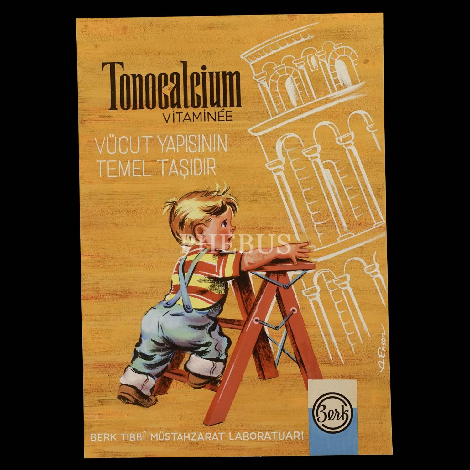 Berk Tıbbî Müstahzarat Laboratuarı üretimi "Tonocalcium Vitaminee" temalı orijinal reklam çizimi, tasarım: A. Enson, 19x26 cm...