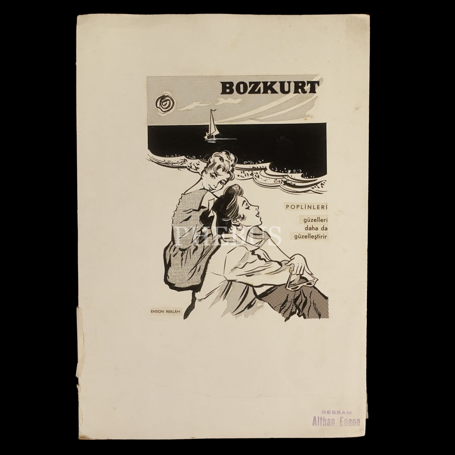 Bozkurt Poplinleri temalı orijinal reklam çizimi, tasarım: Enson Reklâm / Ressam Althan Enson, 24x35 cm...