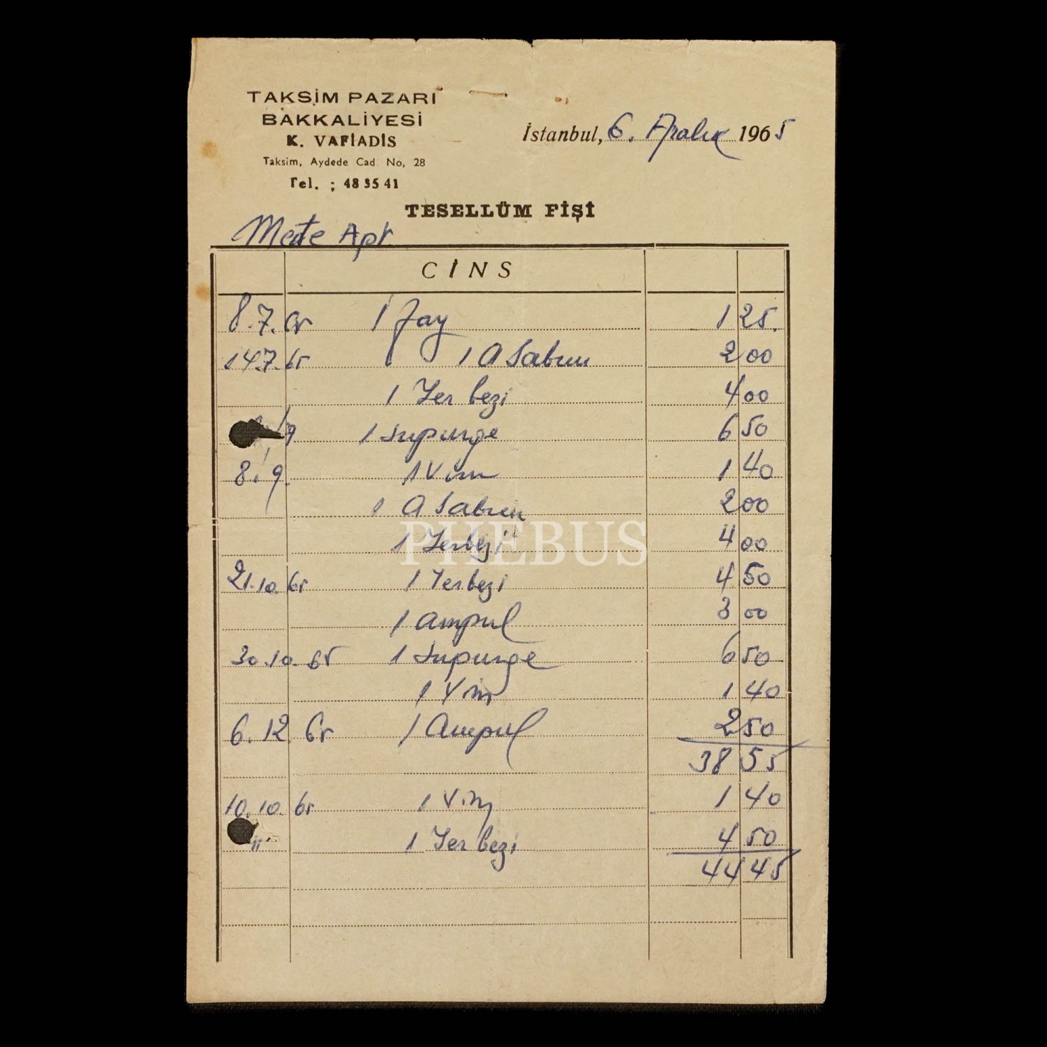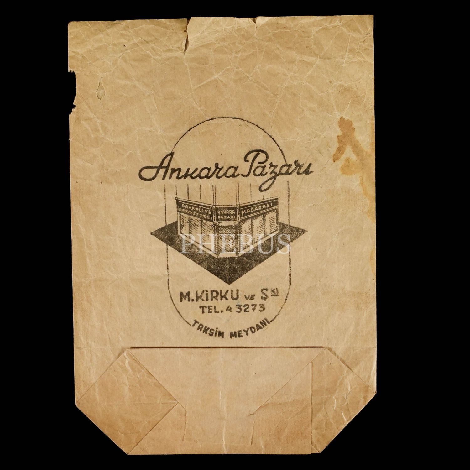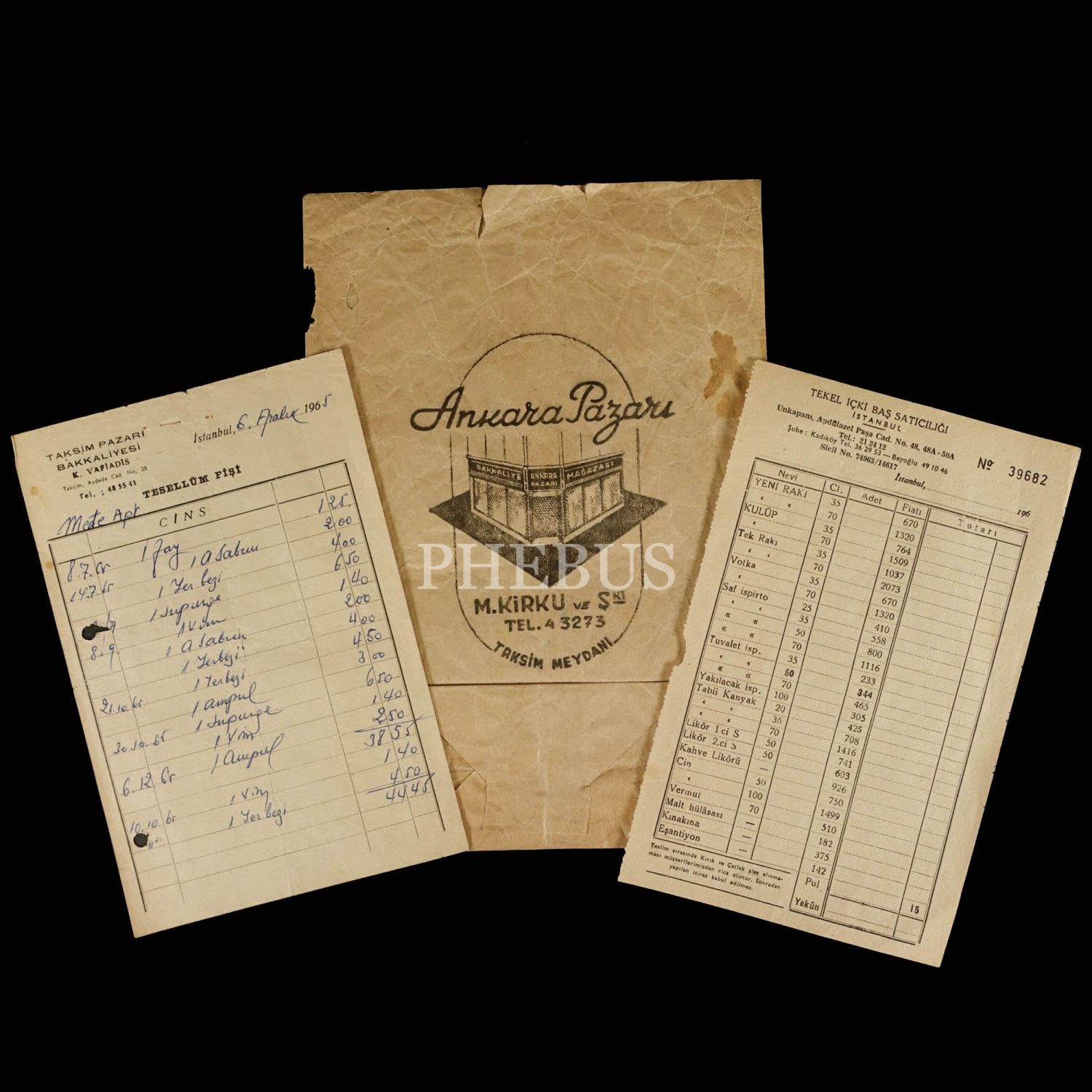 "Ankara Pazarı (Bakkaliye Mağazası) - M. Kirku ve Şki." reklamlı kese, "Taksim Pazarı Bakkaliyesi (K. Vafiadis)" antetli tesellüm fişi ve "Tekel İçki Baş Satıcılığı (İstanbul) antetli fiyat listesi, kese 18x25 cm, evraklar 13x20 cm...