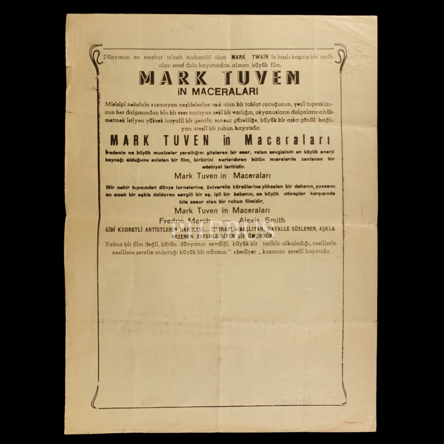 THE ADVENTURES OF MARK TWAIN / MARK TUVEN´İN MACERALARI filminin (1944) İngilizce - Türkçe yazılı tanıtım broşürü, Printed in U.S.A., 29x39 cm...