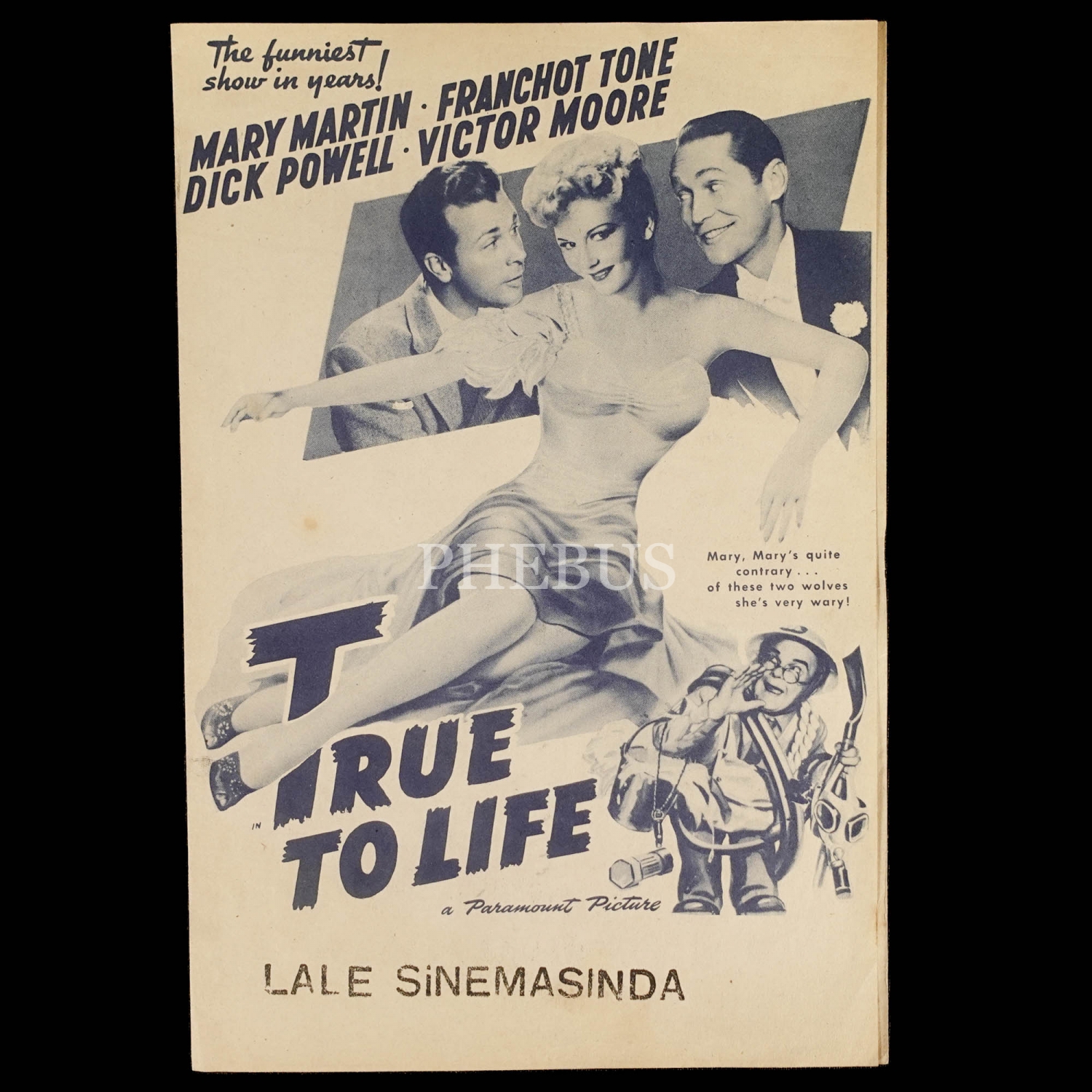 TRUE TO LIFE / SEVDA YARIŞI filminin (1943) Lale Sineması´nda gösterime girdiğini duyuran, İngilizce - Fransızca - Türkçe yazılı el ilanı, 15x23 cm...