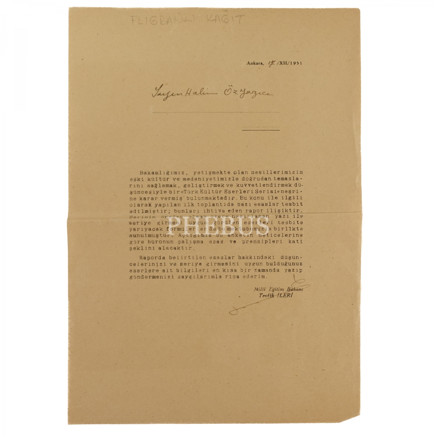 Milli Eğitim Bakanı Tevfik İleri´den Halim Özyazıcı´ya imzalı mektup, 1951, 29x20 cm...