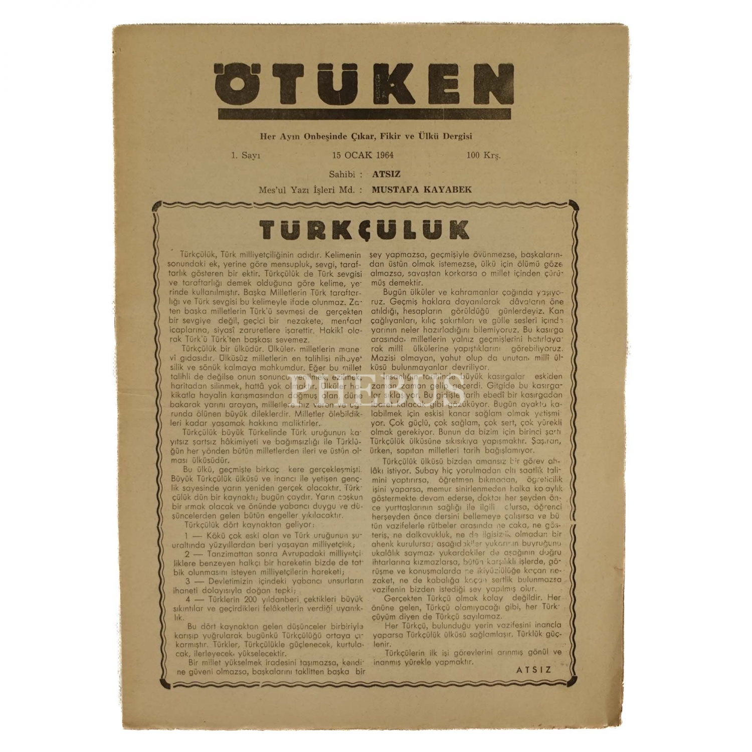 ÖTÜKEN dergisinin, 15 Ocak 1964 tarihli 1. sayısı, 8 sayfa, 21x29 cm...