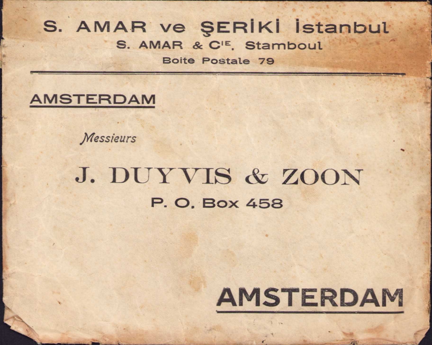 Türkçe ve Fransızca S. Amar ve Şeriki İstanbul antetli zarf, haliyle,