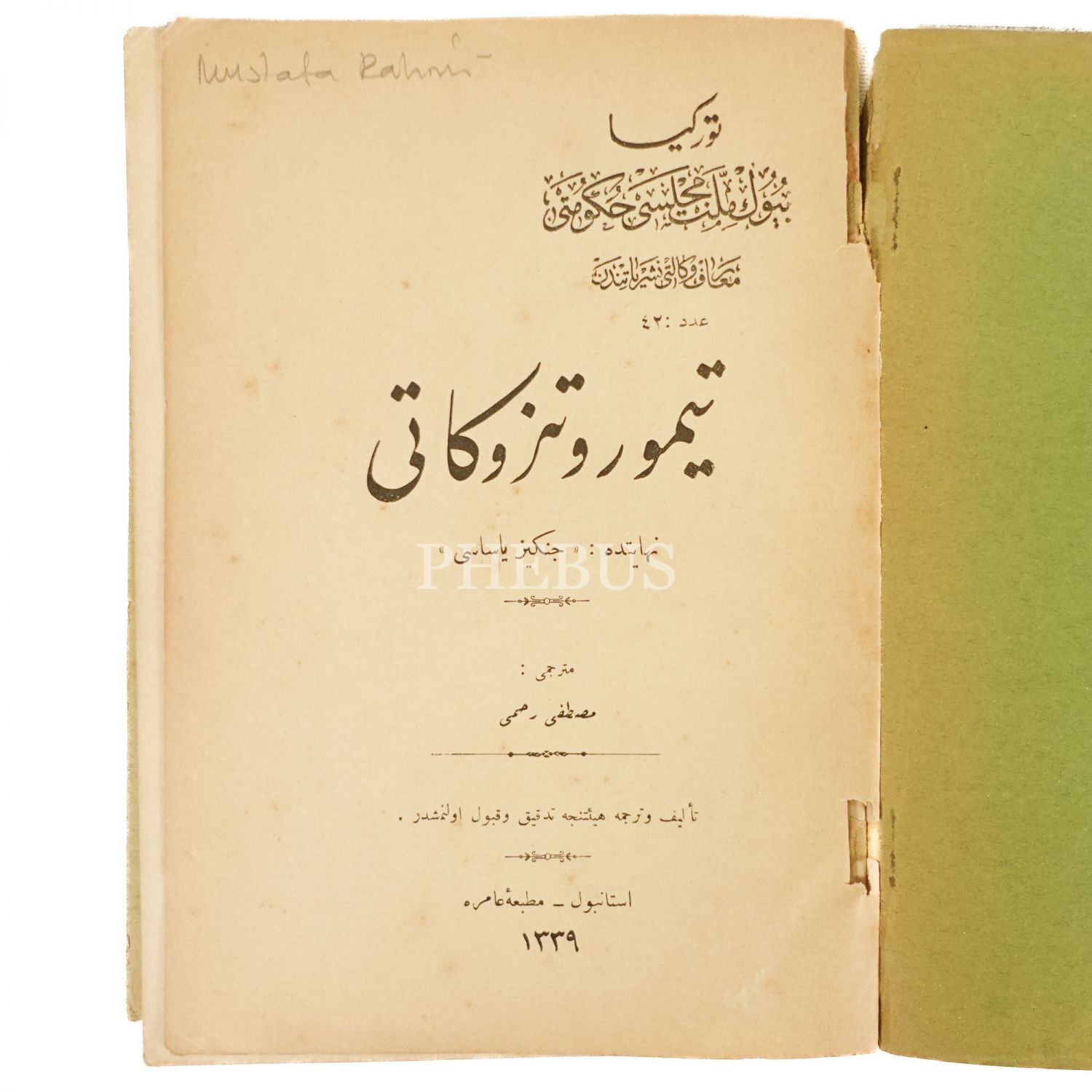 TİMUR VE TÜZÜKÂTI, (Çeviren: Mustafa Rahmi), nihayetinde: Cengiz Yasası, 1339, Matbaa-i Amire, 107 sayfa, 20x14 cm...