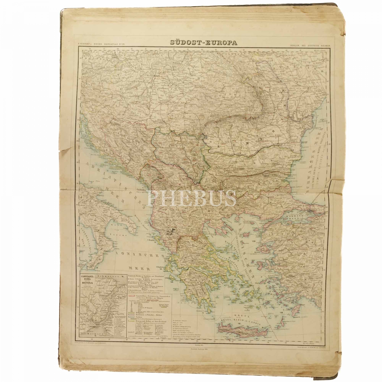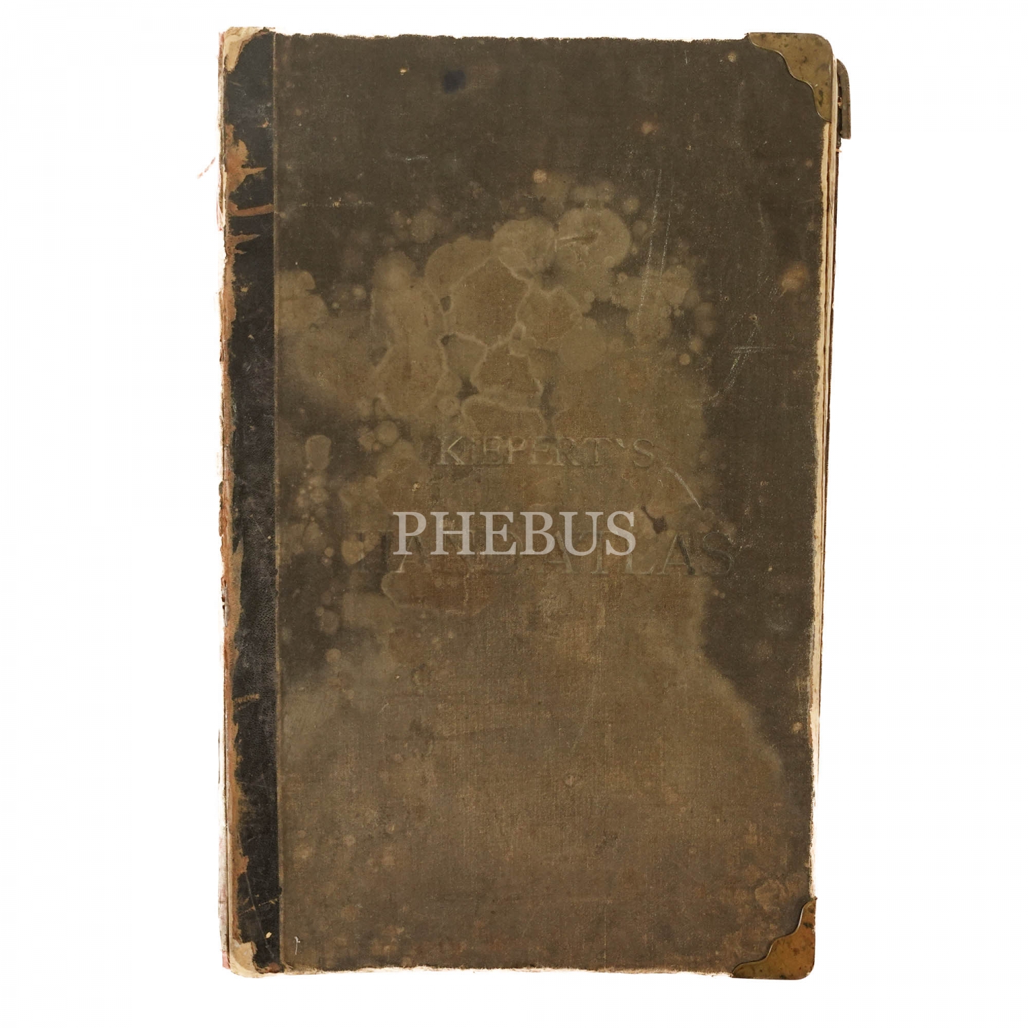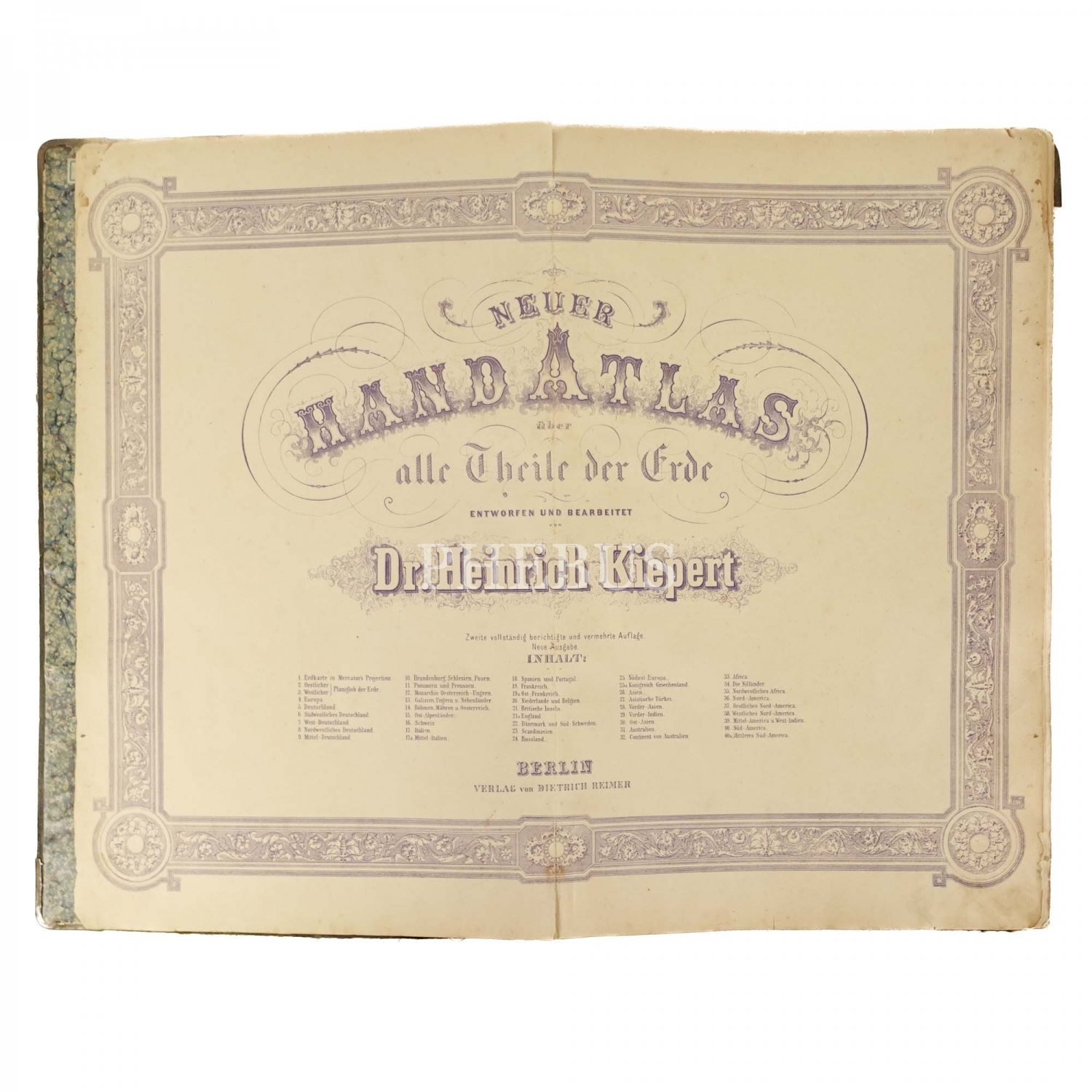Kiepert tarafından hazırlanan "Dünyanın her yerini gösteren yeni el tipi atlas"ın, tamamen düzeltilmiş ve genişletilmiş ikinci baskısı. Günümüze eksiksiz ulaşan atlas içerisinde 45 adet harita yer almaktadır. Kenarları deri kaplamalı tümüyle bez dönem cildinde. Kapak köşelerinde pirinç koruma başlıkları mevcuttur (arka kapağın alt köşesindeki eksik). İç kapakları ebrulu. *Deri sırtı kopmuş, geriye bez kaplama kalmıştır.