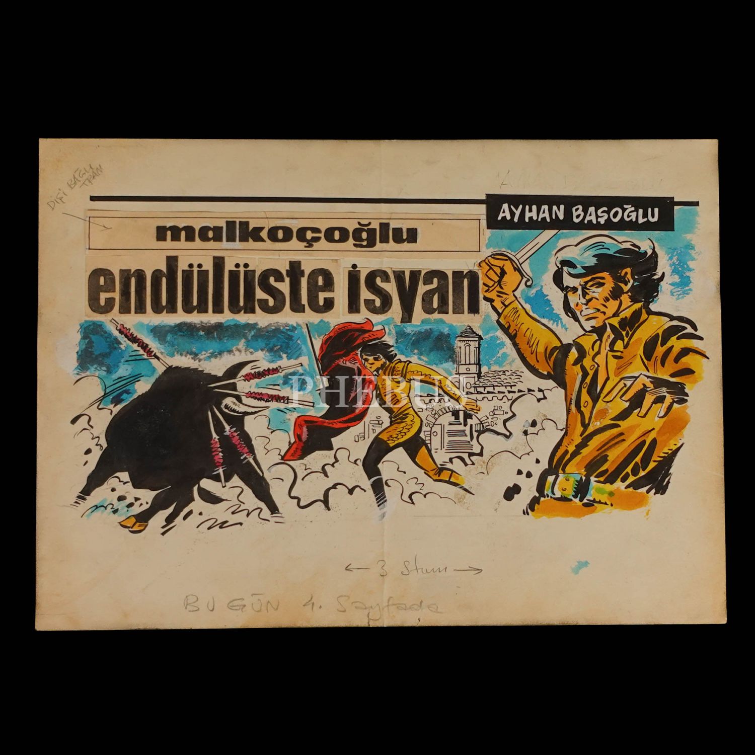 Ayhan Başoğlu´ndan orijinal çizim Malkoçoğlu (Endülüste İsyan) kapağı, kâğıt üzeri çini mürekkebi ve sulu boya, 35x25 cm...