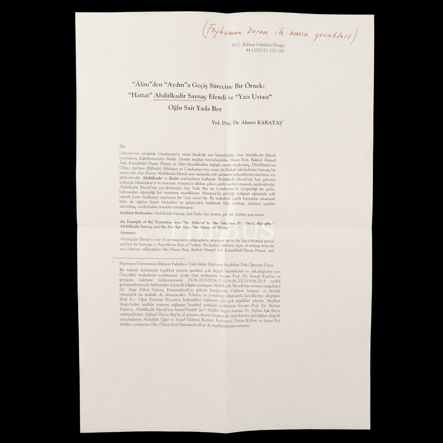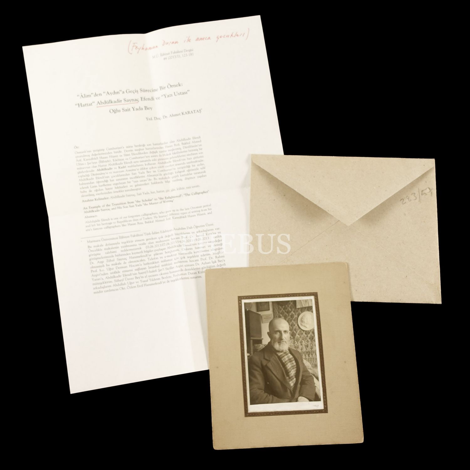 Hattat Abdülkadir Saynaç´ın Süheyl Ünver tarafından çekilmiş fotoğrafı, 14x12 cm...