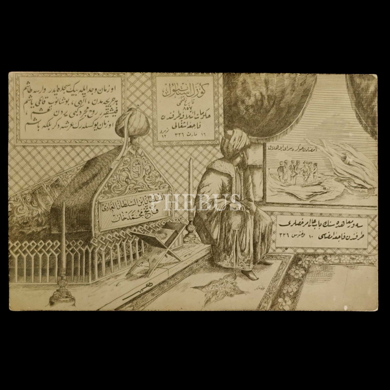 Fatih Sultan Mehmed´in, Sevr Muahedesi´nin imzasından sonra el sıkışan Osmanlı ve İtilaf Devletleri temsilcilerini kabrinden acıyla izlerken tasvir edildiği, "Sevr Muahedesi´nin Babıali murahhasları tarafından facia-i imzası. 10 Ağustos 1336" başlıklı kartpostal, ed. Foto Mükerrem, 14x9 cm...