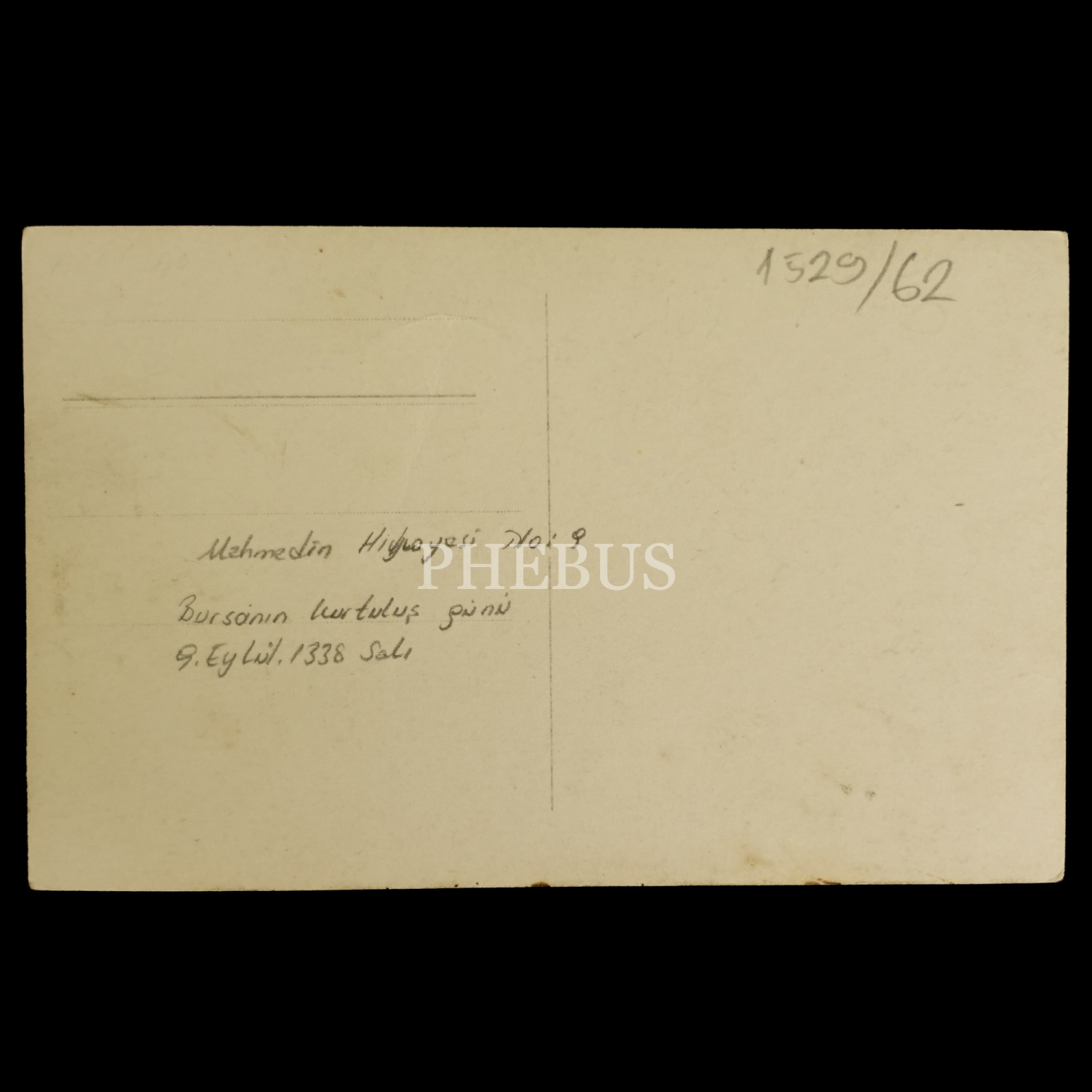 "Yeşil Bursa´nın kurtuluş günü: 9 Eylül 1338" yazılı ve "Mehmed´in Hikâyesi Numara 32" başlıklı kartpostal, ed. Foto Mükerrem, 14x9 cm...
