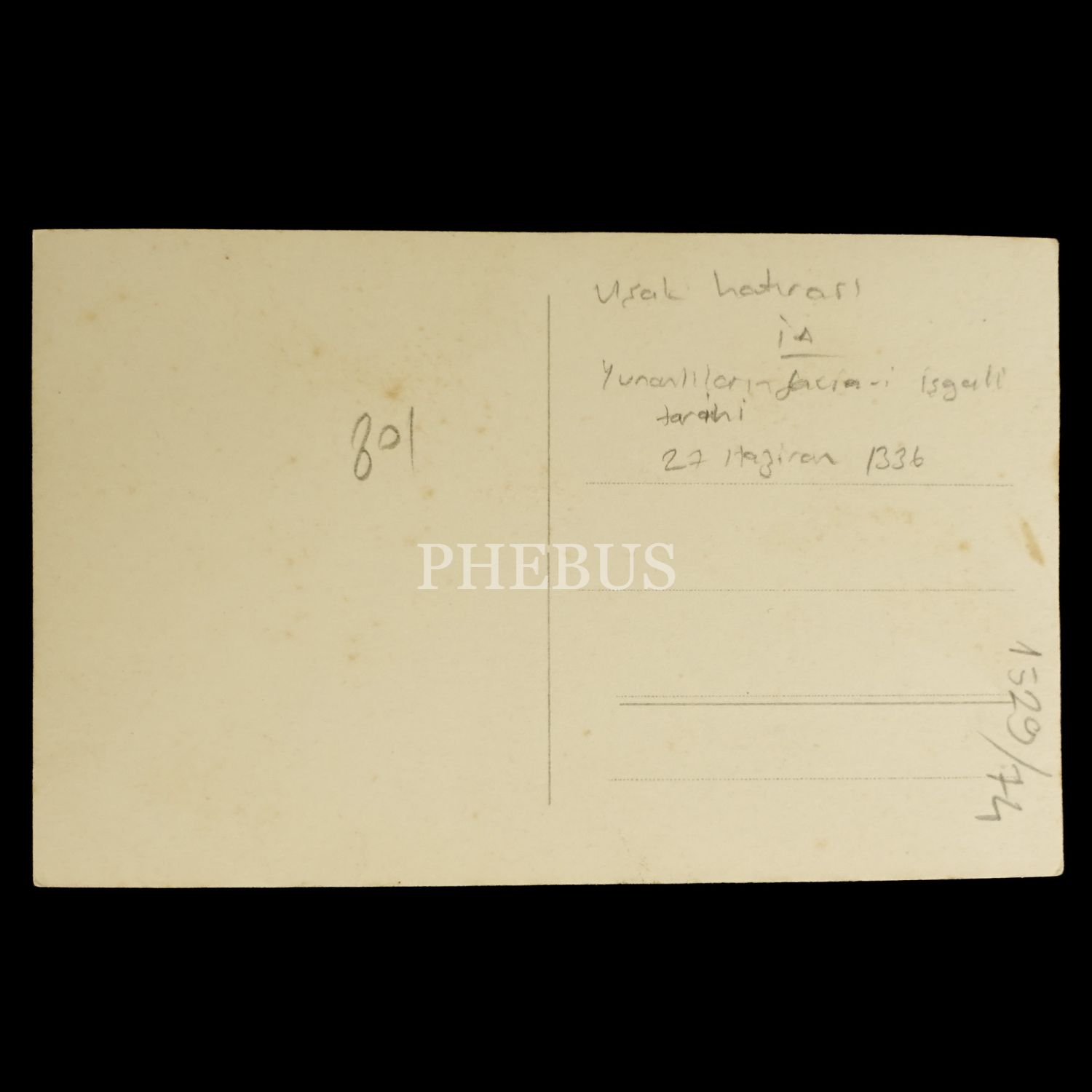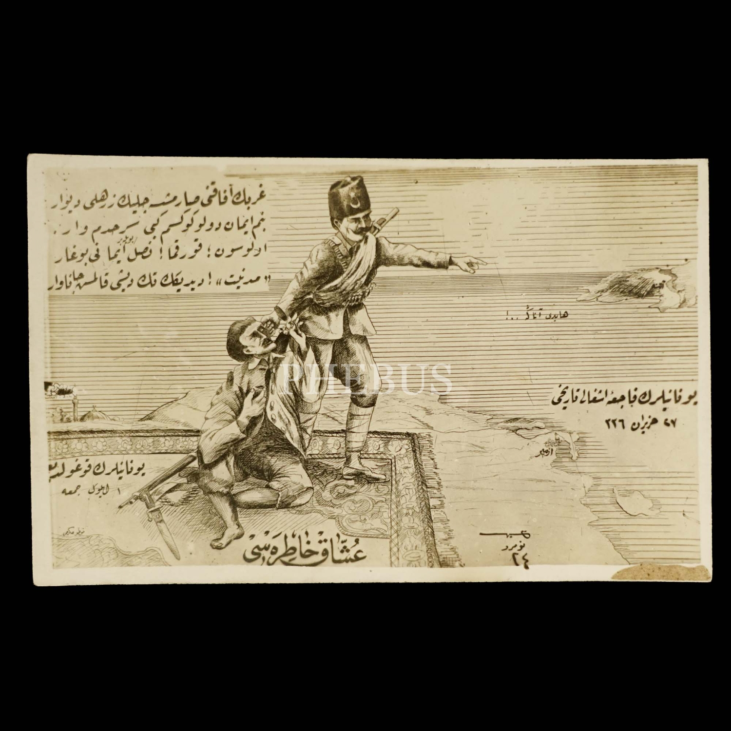 Kulağından tuttuğu Yunan askerini "Haydi anana!" diyerek Uşak´tan kapı dışarı eden Mehmetçik görselli ve "Uşak Hatırası: Yunanlıların kovulduğu 1 Eylül Cuma" yazılı kartpostal, 14x9 cm...