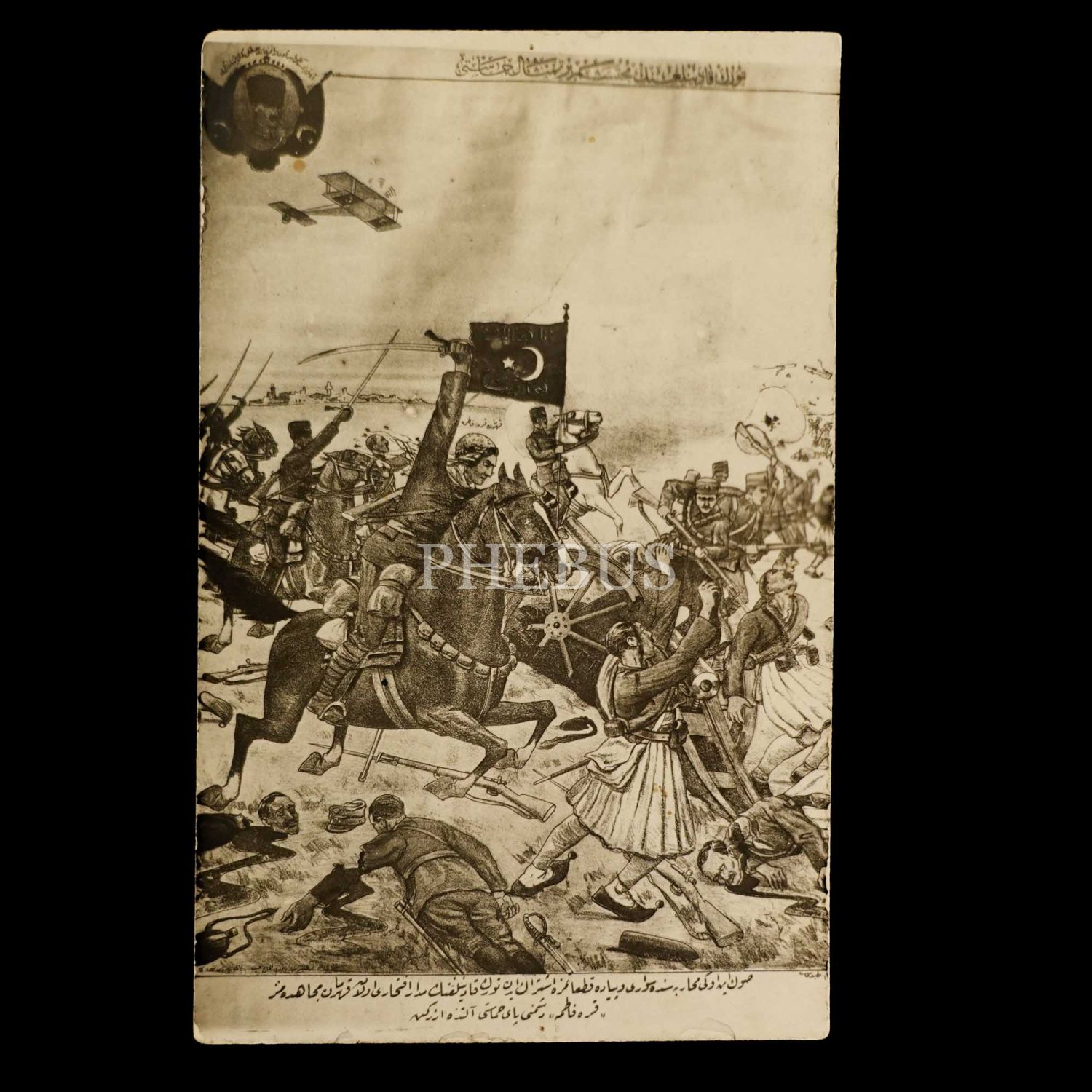 "Türk kadınlığının muhteşem bir timsal-i hamaseti" başlıklı ve "Son İnönü Muharebesinde süvari ve piyade kıtaatımıza iştirak eden Türk kadınlığının medar-ı iftiharı olan kahraman mücahidemiz Kara Fatma düşmanı pây-ı hamaseti altında ezerken" yazılı, orduyla birlikte hücuma kalkan Kara Fatma görselli kartpostal, 9x14 cm...