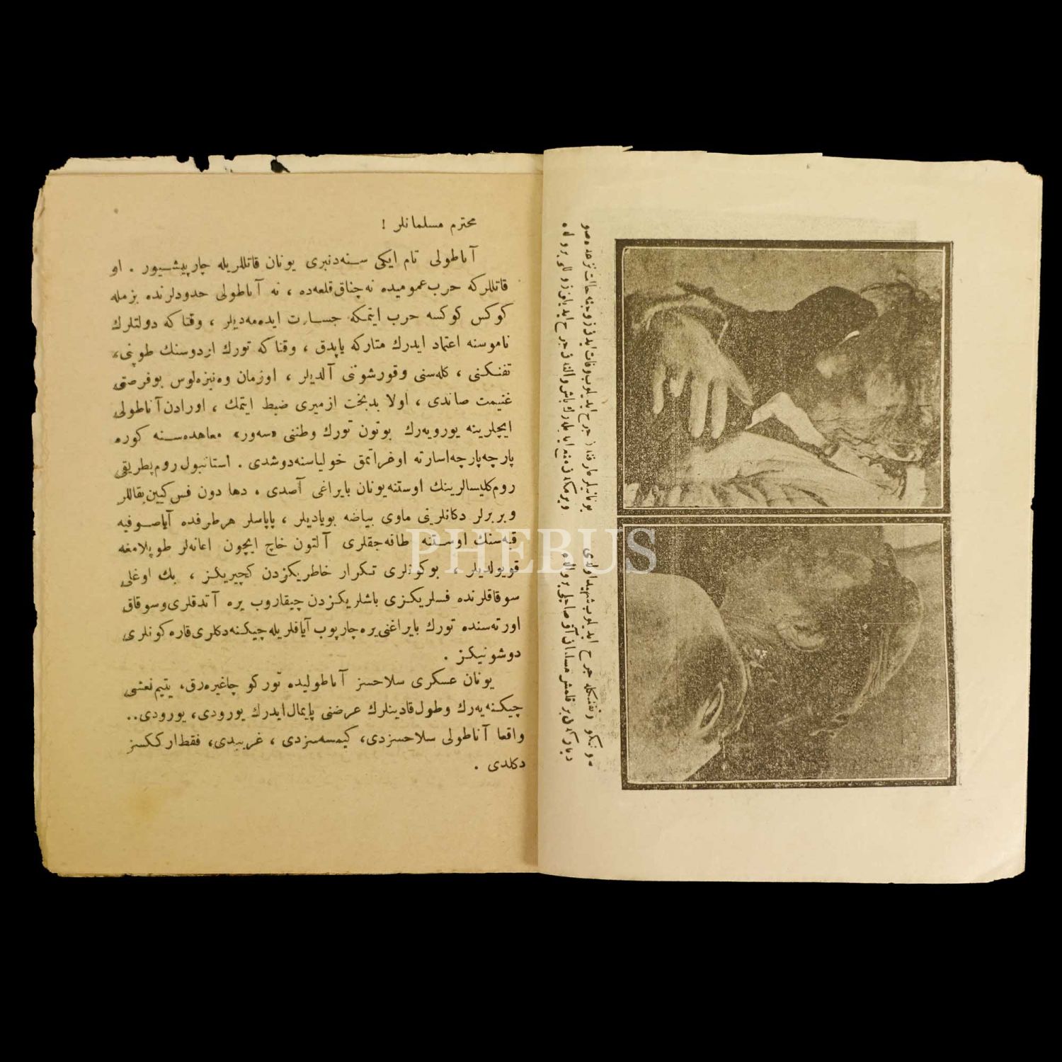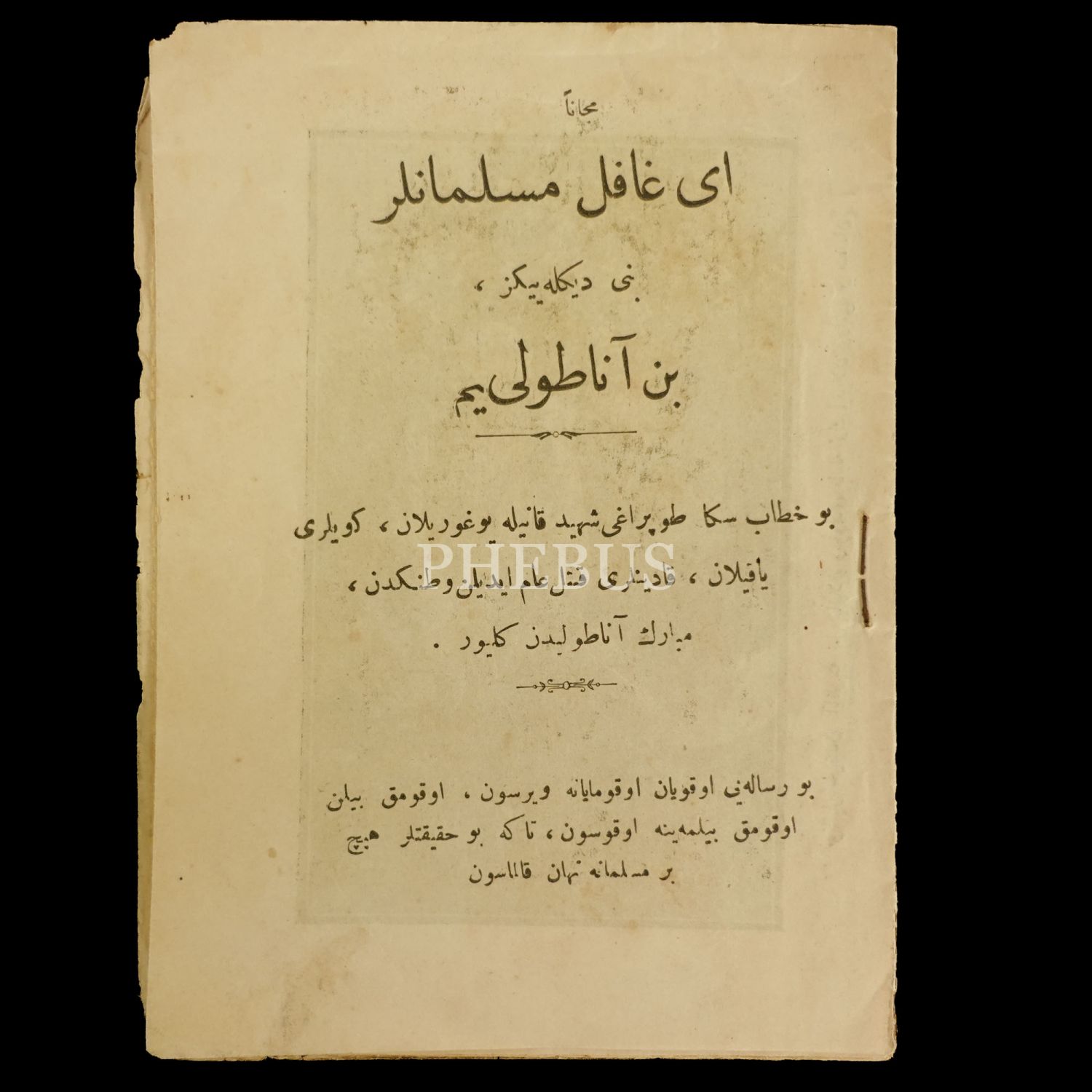 EY GAFİL MÜSLÜMANLAR BENİ DİNLEYİNİZ BEN ANADOLUYUM, "Bu hitap sana toprağı şehit kanıyla yoğrulmuş, köyleri yakılan, kadınları katliam edilen vatanından, mübarek Anadolu´dan geliyor.", "Bu risaleyi okuyan okumayana vesin, okumak bilen okumak bilmeyene okusun, ta ki bu hakikatler hiçbir müslümana nihan olmasın.", 14 sayfa, 17x12 cm...