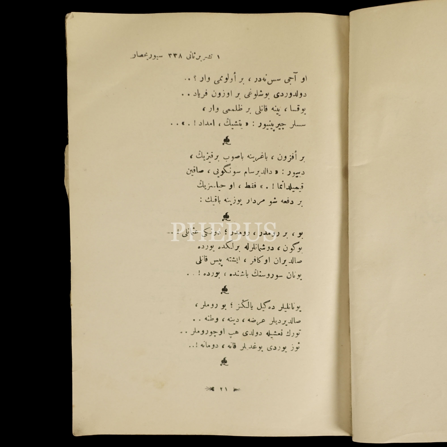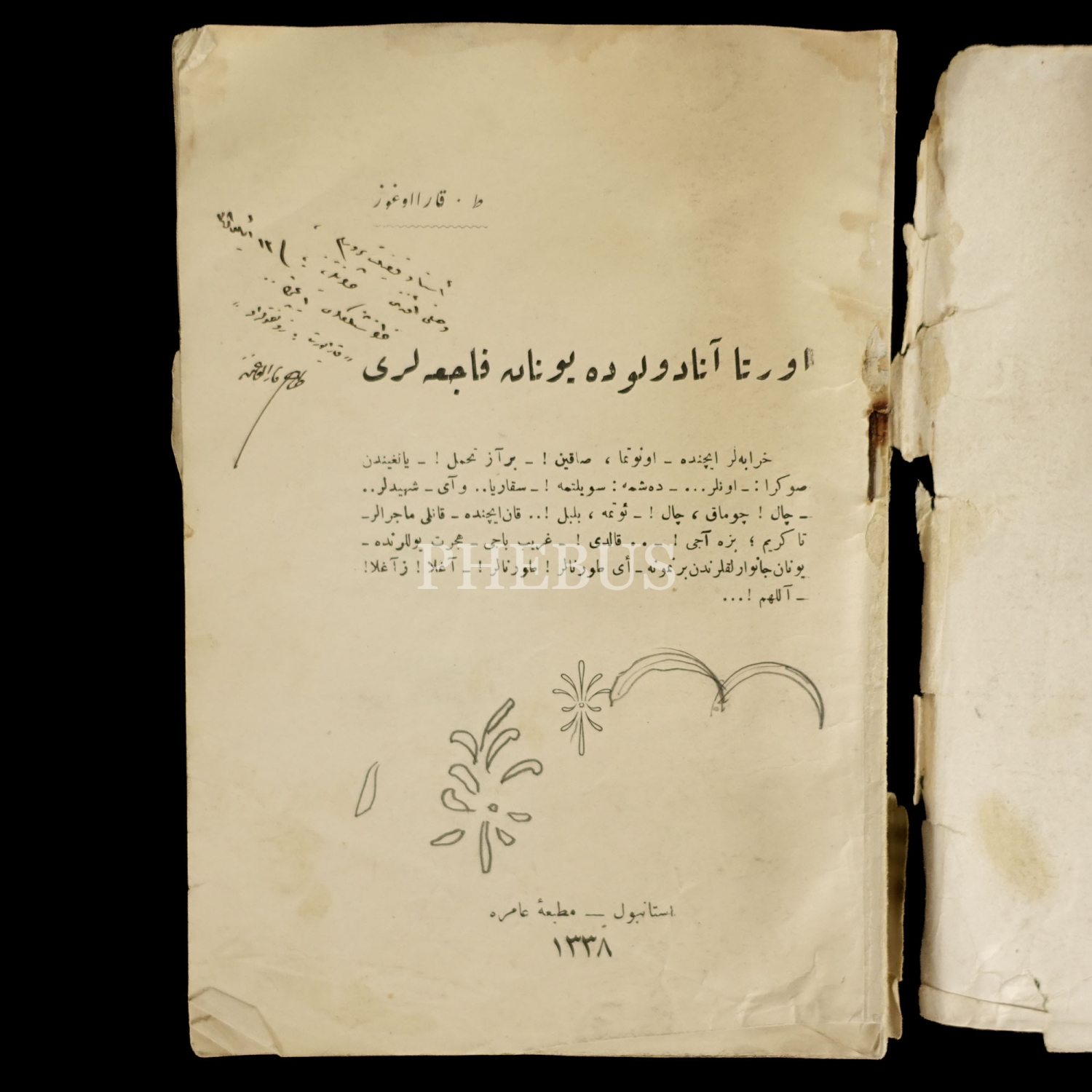 ORTA ANADOLU´DA YUNAN FACİALARI, T. Karauğur, 1338, Matbaa-i Amire, 96 sayfa, cildinden ayrık ve cildi yorgun haliyle, 20x14 cm...