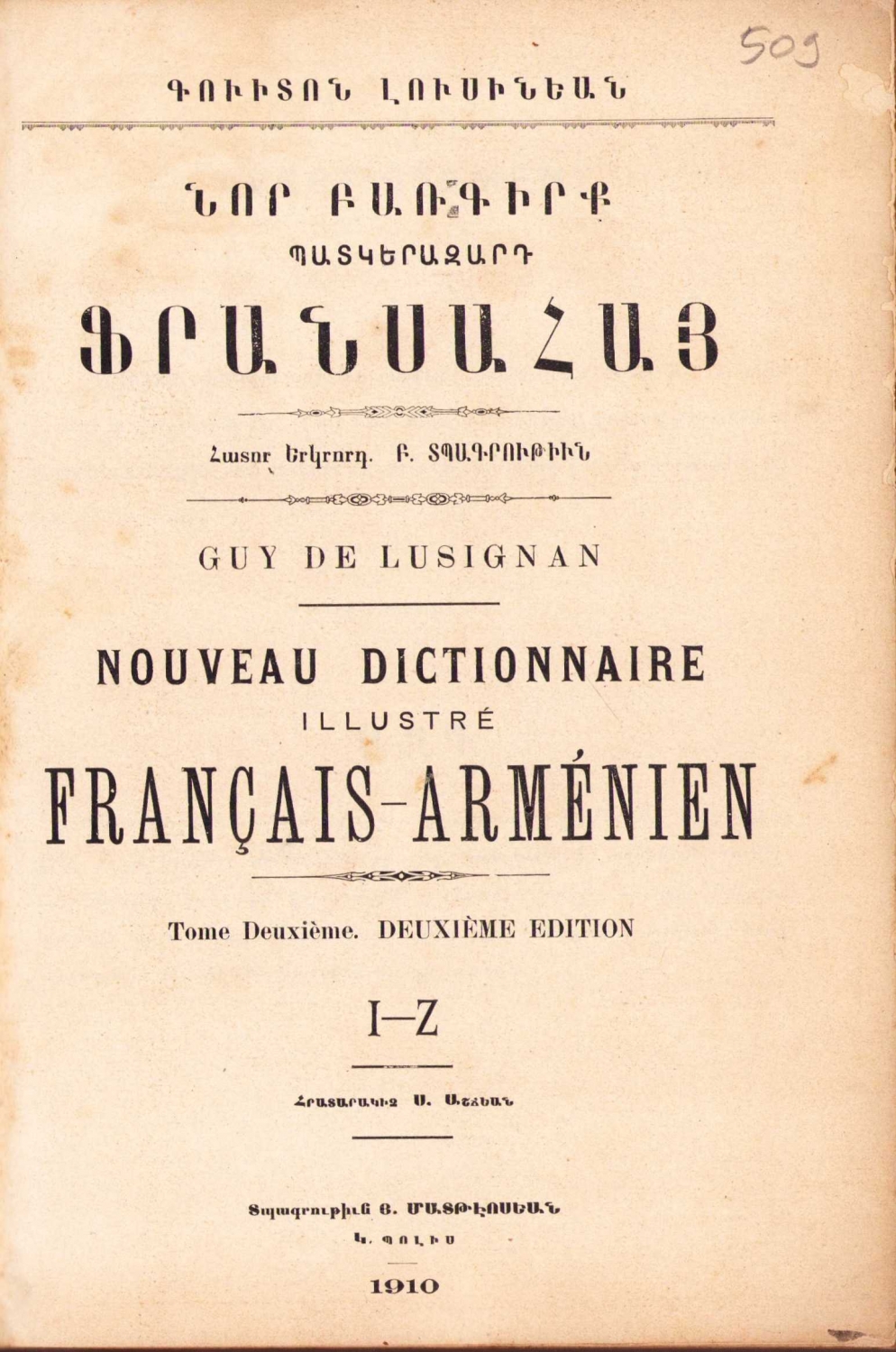 Ermenice-Fransızca Sözlük, Guy de Lusignan, İki Cild, İkinci Baskı, 1909, Ermenice-Fransızca,1059+814 sayfa, 17x25 cm.