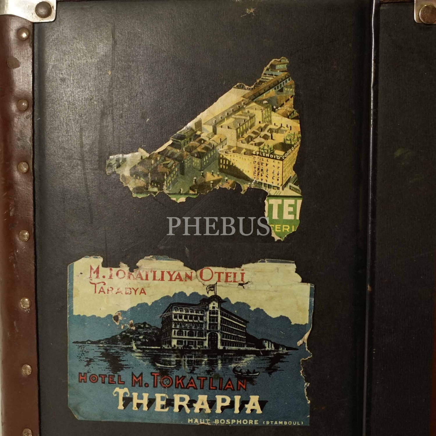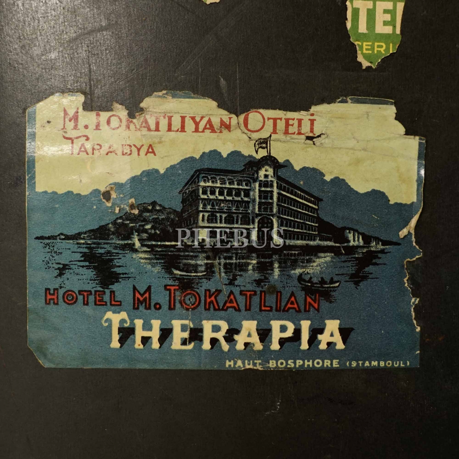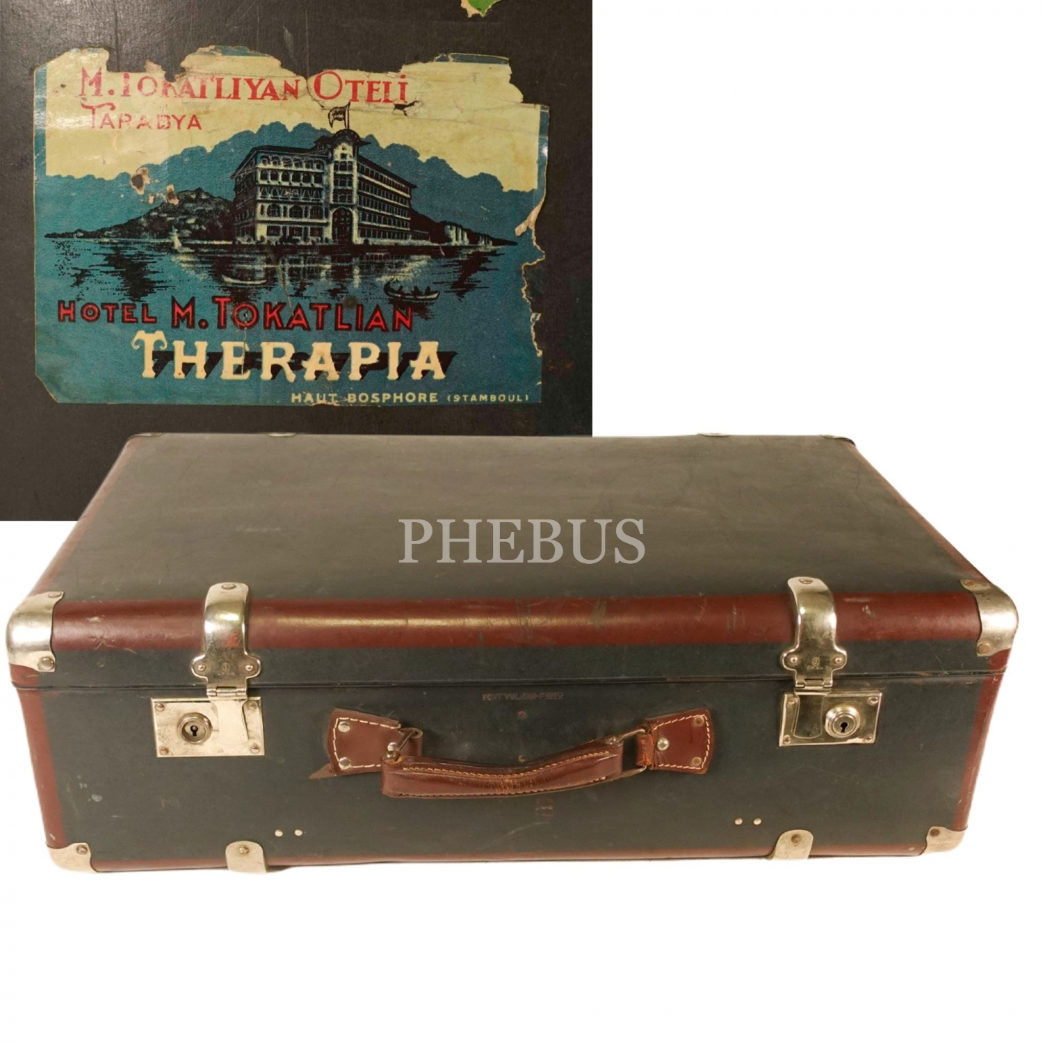 Kenarında Türkçe-Fransızca "M. Tokatlıyan Oteli (Tarabya) / Hotel M. Tokatlian (Therapia)" etiketi yer alan, Echt Vulkan-Fiber marka seyahat bavulu, 75x41x24 cm...