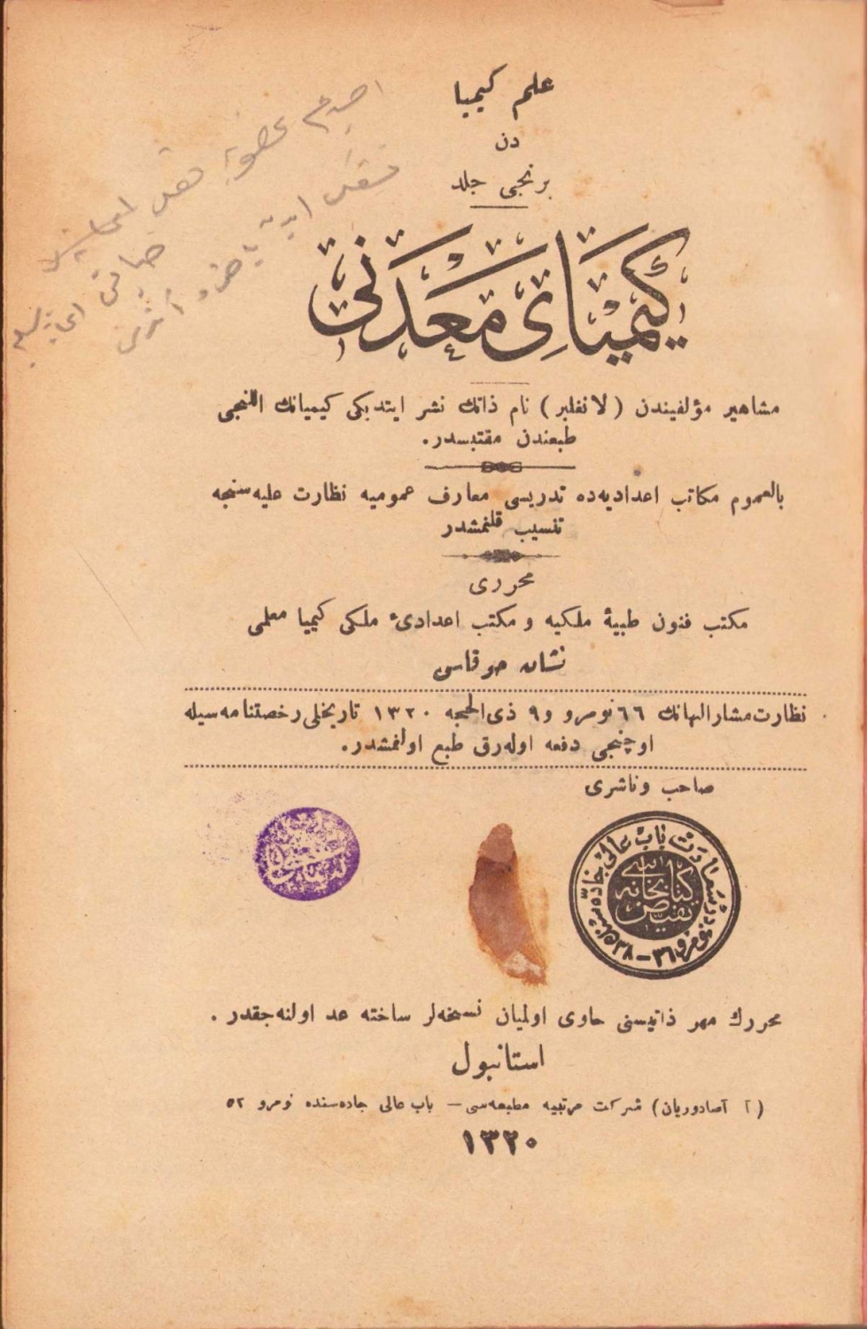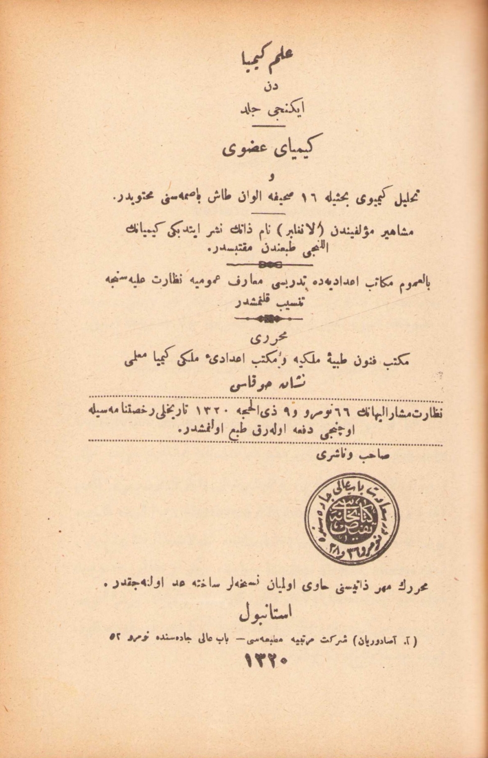 Kimya-yı Madeni (I. Cild) ve Kimya-yı Uzvi (II. Cild), [Tek Cildde İki Eser], Muharriri: Nişan Hokas, Tefeyyüz Kitabhanesi, İstanbul, 1325, Osmanlıca, 816 sayfa, 13x20 cm.