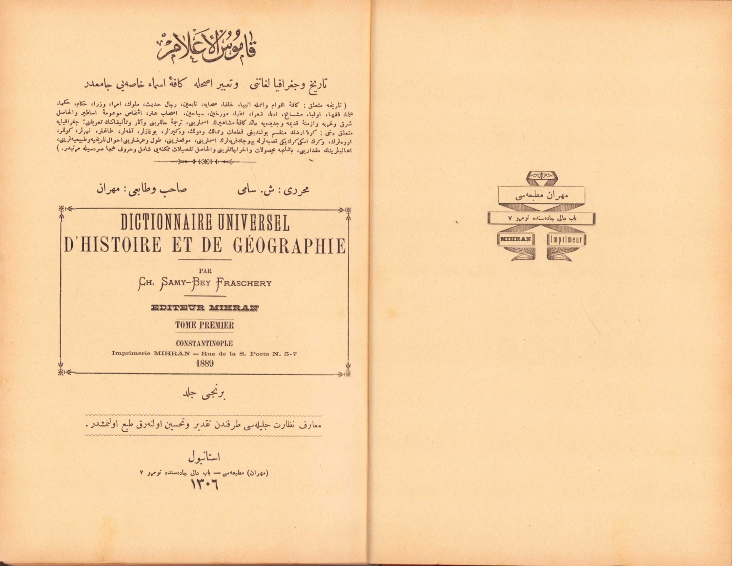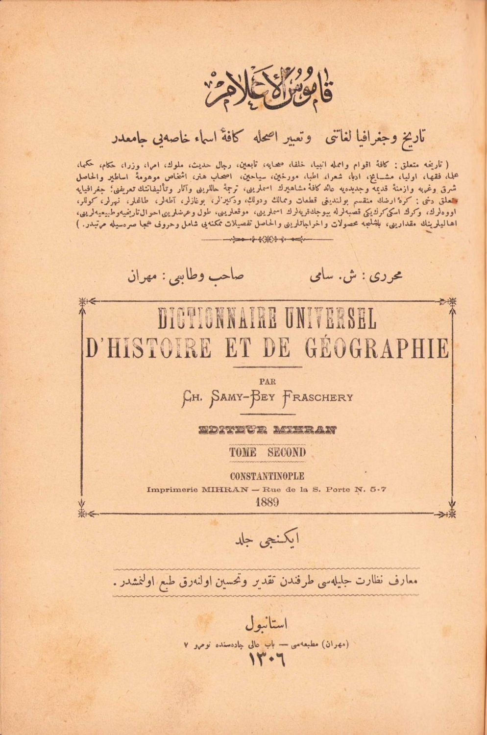 Kamus-ı A'lam, Tarih ve Coğrafya Lugati, İki Cild, Muharriri: Şemseddin Sami, Sahib ve Tabii: Mihran, Mihran Matbaası, İstanbul, 1306, Osmanlıca, 1600 sayfa, 17x24 cm.