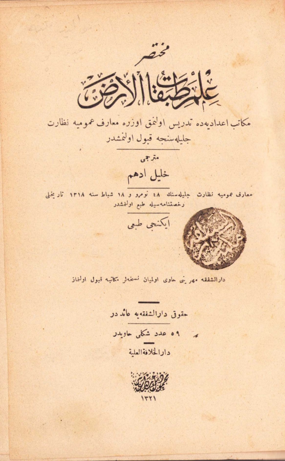 Muhtasar İlm-i Tabakatü'l-Arz Yahud Jeoloji, Mütercimi: Halil Edhem, İkinci Tab'ı, Mahmud Bey Matbaası, 1321, Osmanlıca, 208 sayfa, 13,5x20 cm.