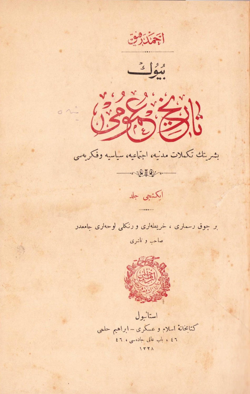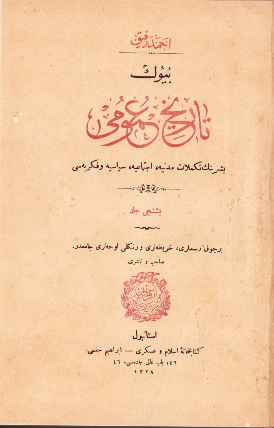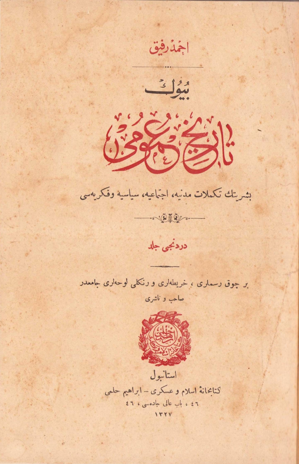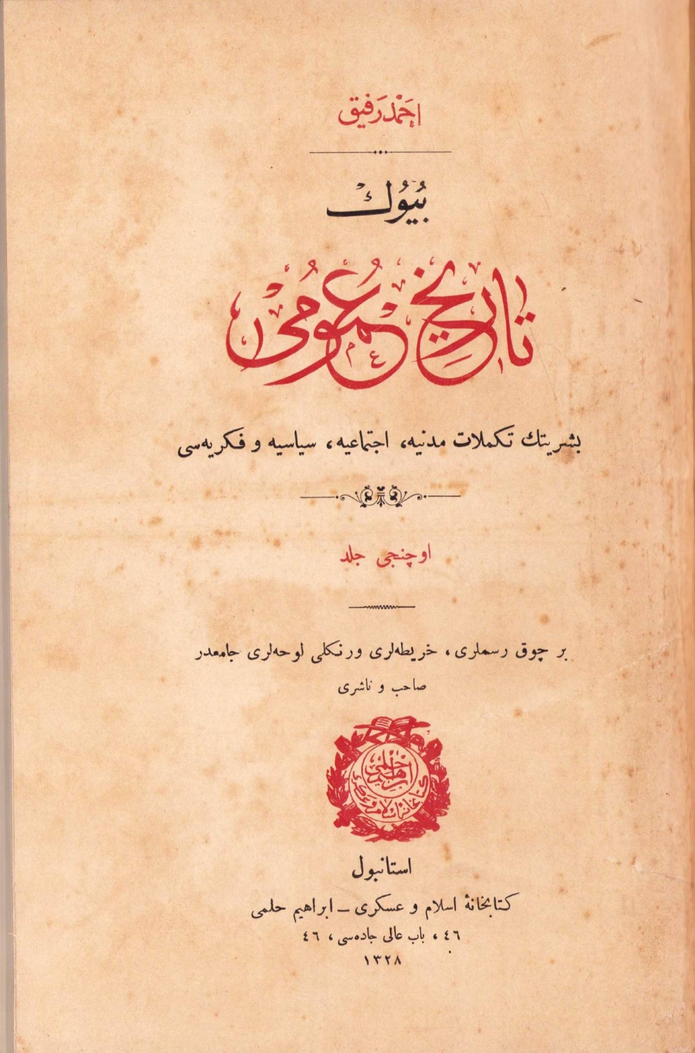 Büyük Tarih-i Umumi [Genel Tarih], Ahmed Refik [Altınay], İlk Beş Cild, Naşiri: İbrahim Hilmi, Matyosyan Matbaası, 1328, Osmanlıca, 16,5x24 cm.