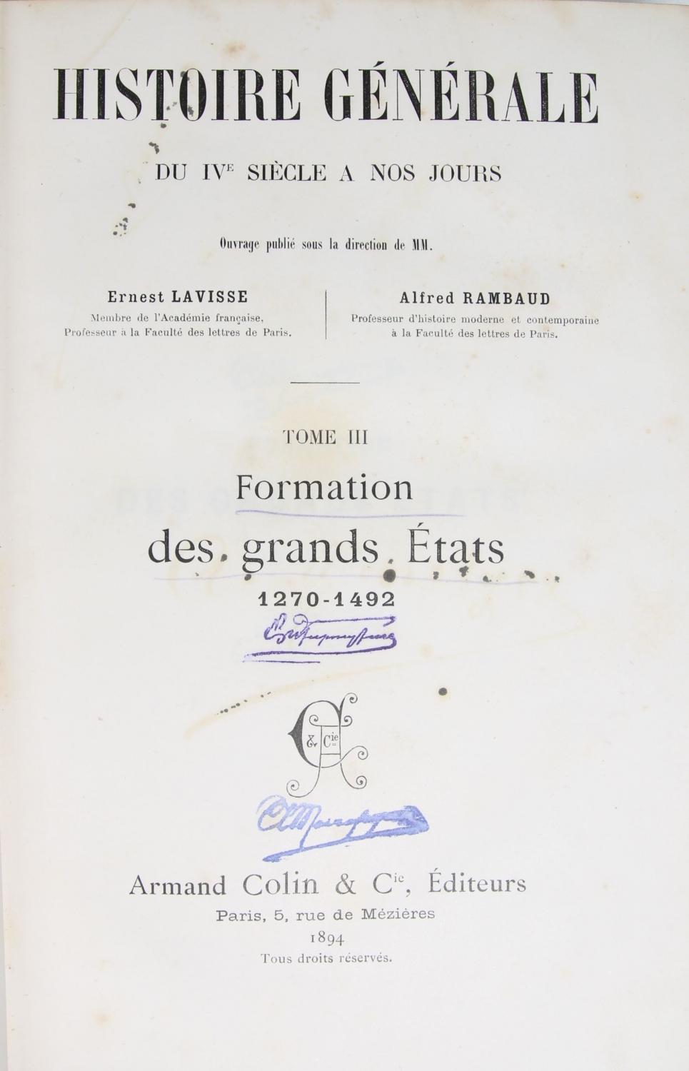Histoire Generale du IV. Siecle A Nos Jours [4. Asırdan Günümüze Genel Tarih], III. Cild (1270-1492), Ernest Lavisse ve Alfred Rambaud, Armand Colin, Paris, 1894, Fransızca, 984 sayfa, 15,5x24 cm.