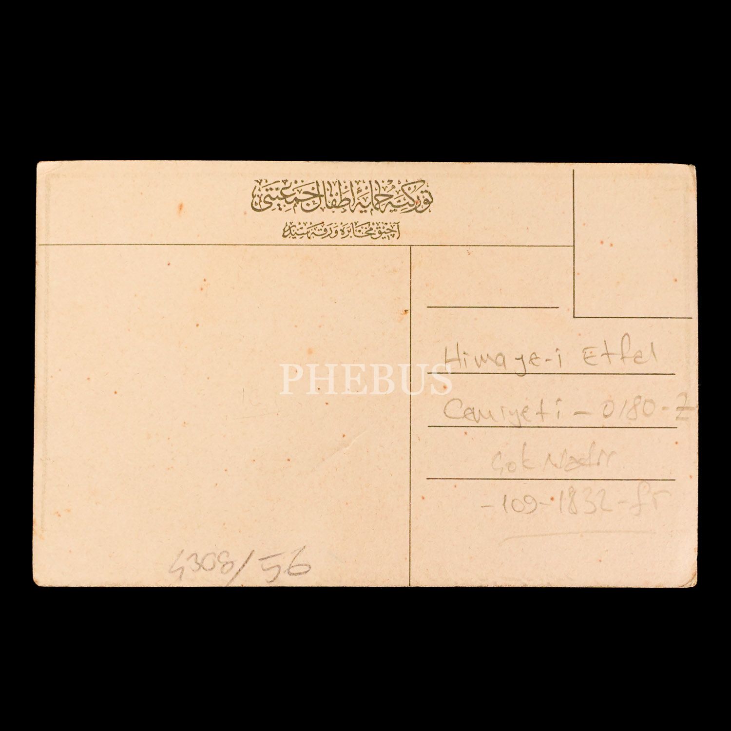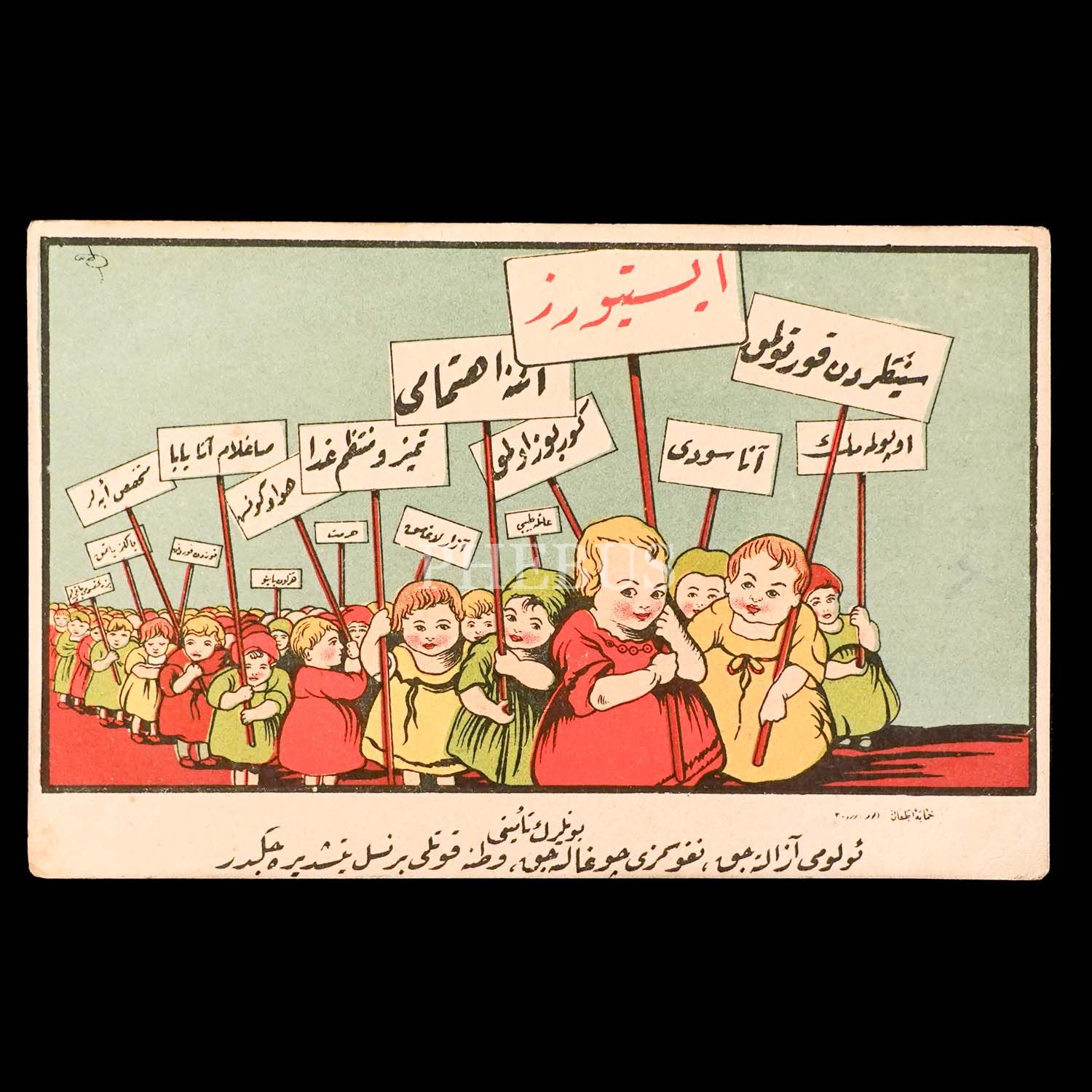 Ellerinde "Sineklerden Korunmak - Öpülmemek - Anne Sütü - Anne İhtimamı (İstiyoruz)" yazılı pankartlarla yürüyüş yapan çocuklar görselli Himaye-i Etfal Cemiyeti kartpostalı...
