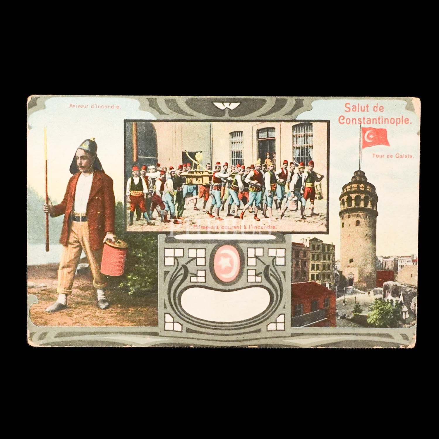 Tulumbacılar ve Galata Kulesi görselli parçalı kartpostal, "Salut de Constantinople"...