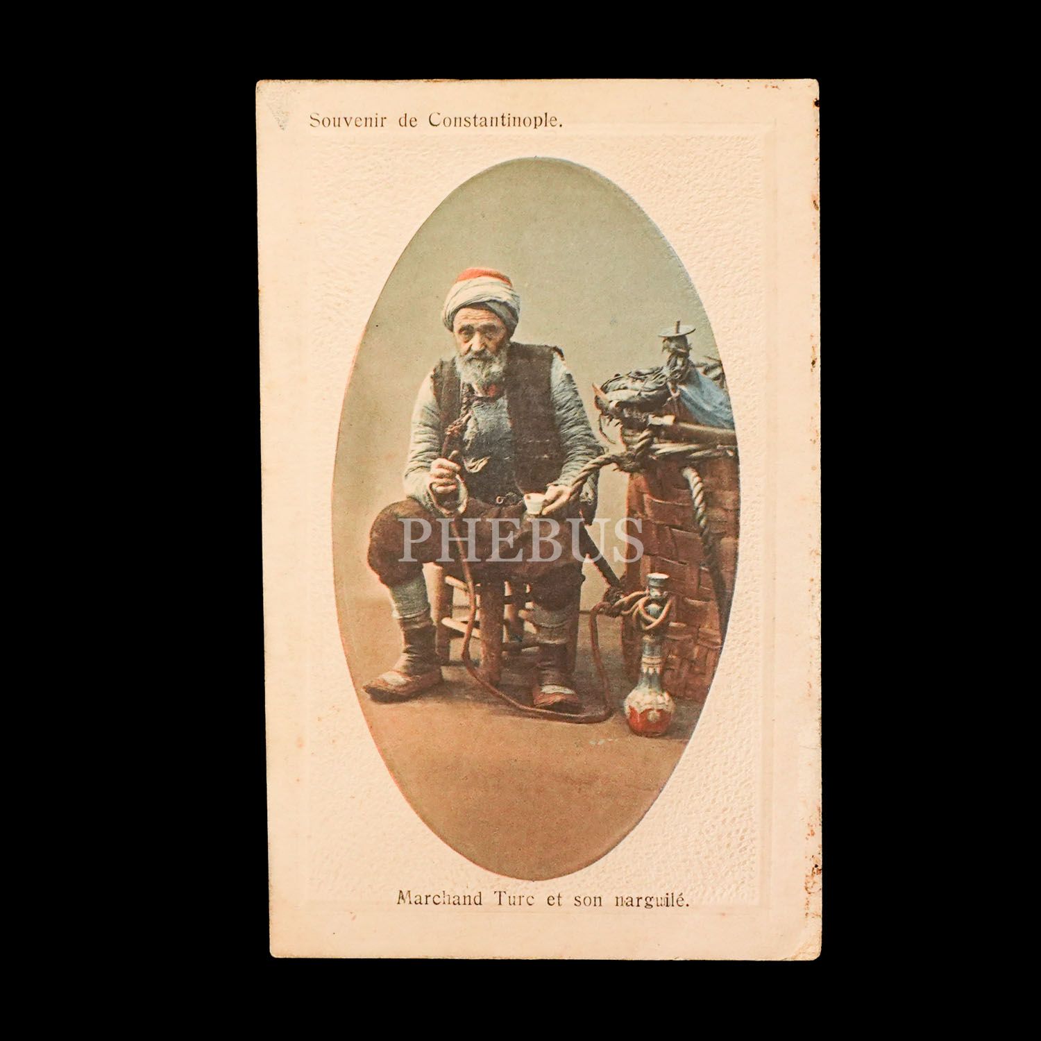 Nargilesiyle poz veren bir Türk tüccarı görselli gofre kartpostal, "Marchand Turc et son narguile - Souvenir de Constantinople", ed. Sinan, Constantinople...