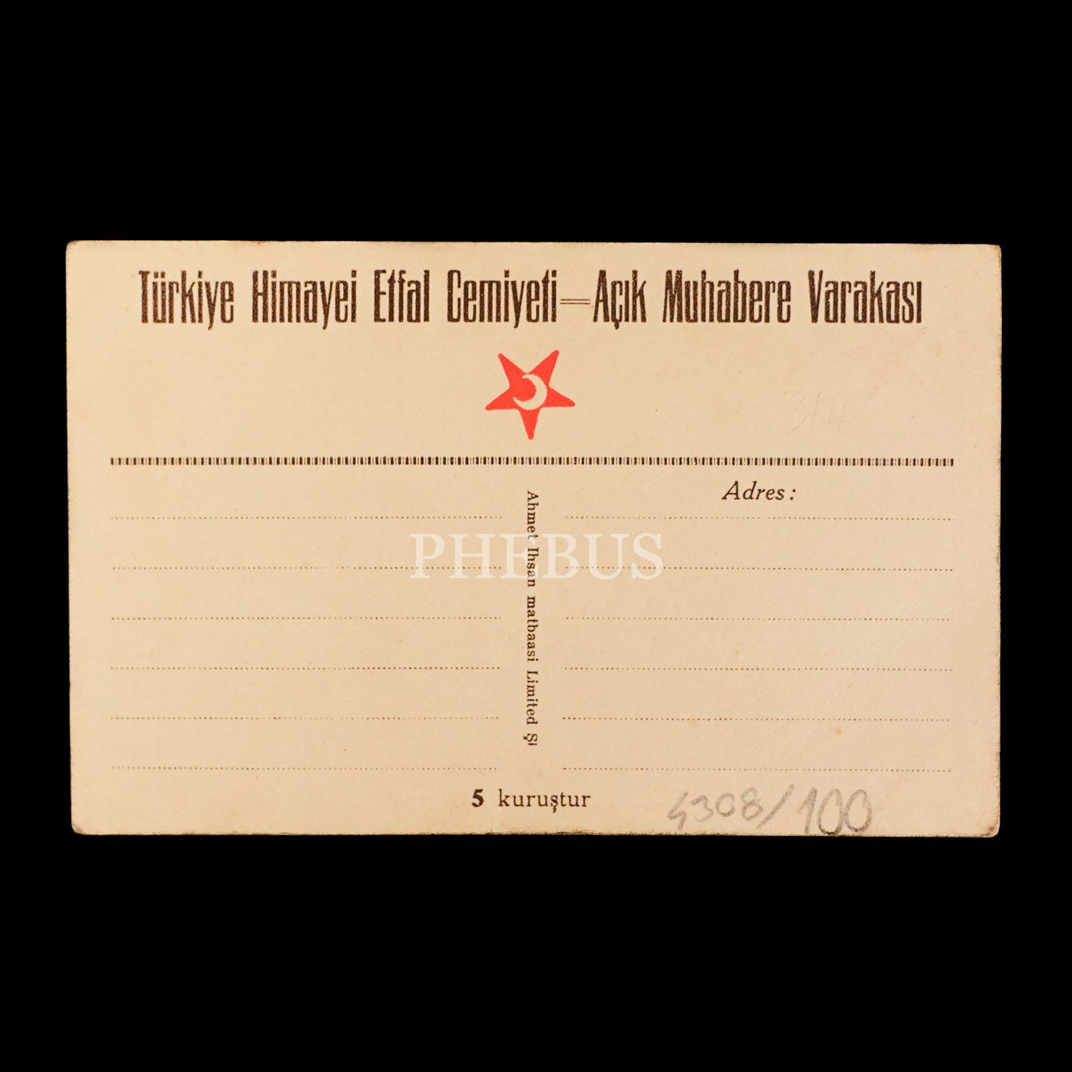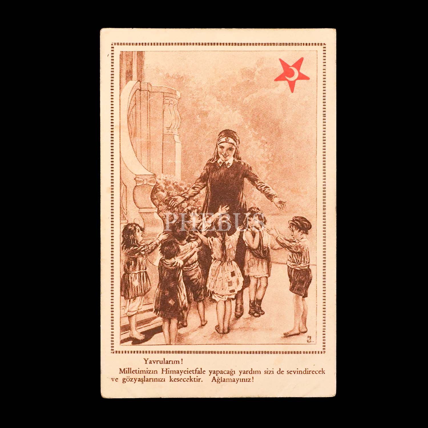 "Yavrularım! Milletimizin Himayeietfale yapacağı yardım sizi de sevindirecek ve gözyaşlarınızı kesecektir. Ağlamayınız!" yazılı Himaye-i Etfal Cemiyeti kartpostalı, Ahmet İhsan Matbaası Limited Şi...