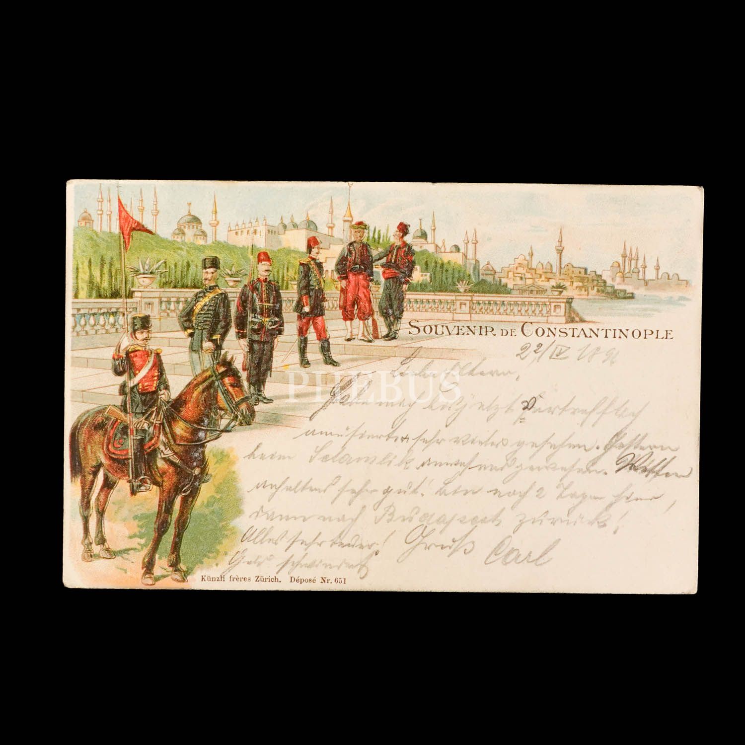 Osmanlı askerleri görselli ve İstanbul manzaralı kartpostal, "Souvenir de Constantinople", ed. Künzli Freres, Zürich...