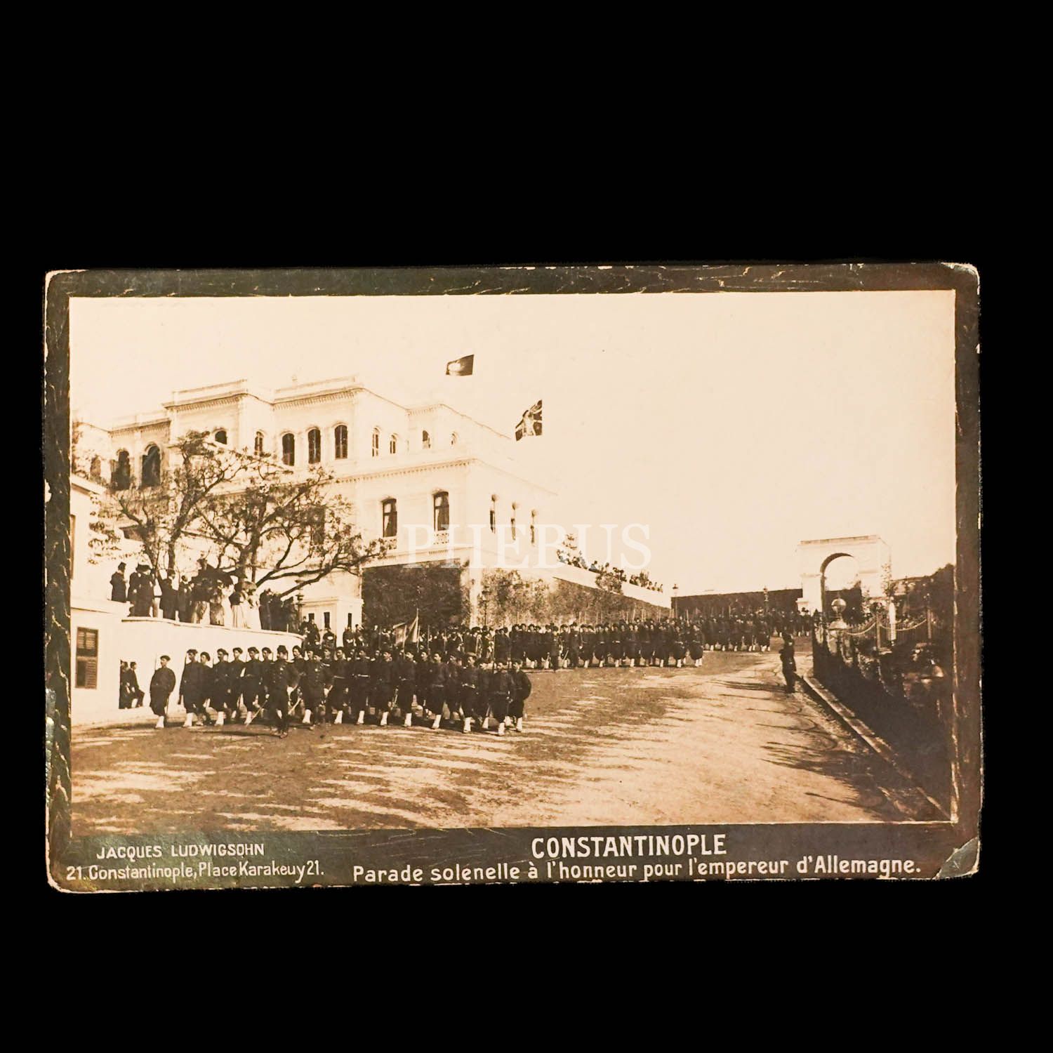 İstanbul´u ziyaret eden Almanya İmparatoru Kayzer Wilhelm´in şerefine Yıldız Sarayı´nda tertip edilen görkemli geçit merasiminden bir manzara, "Constantinople - Parade solenelle a l´honneur pour l´empereur d´Allemagne", ed. Jacques Ludwigsohn, Place Karakeuy...