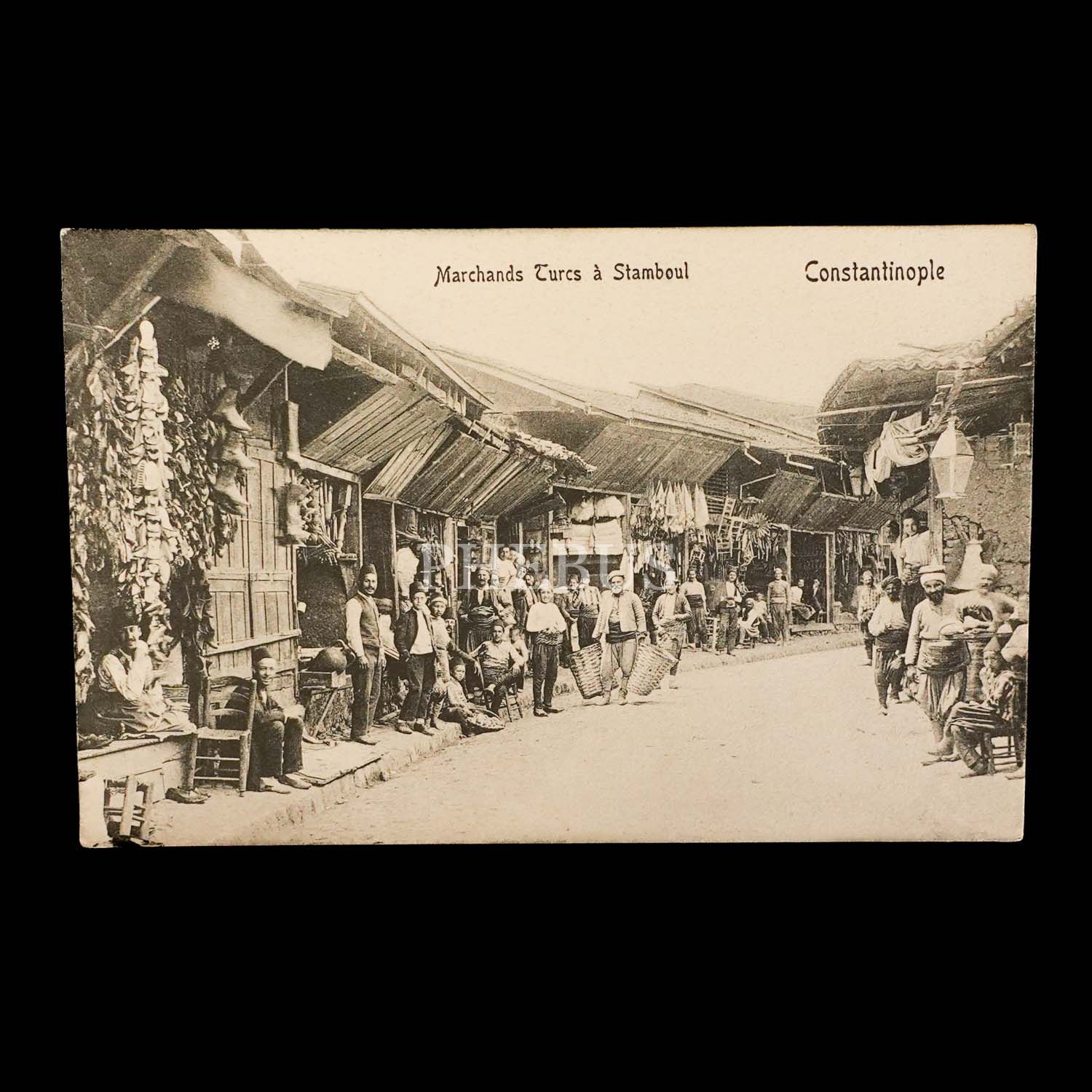 Bir İstanbul çarşısında Türk esnaflar, "Marchands Turcs a Stamboul - Constantinople", ed. Au Bon Marche, Pera...