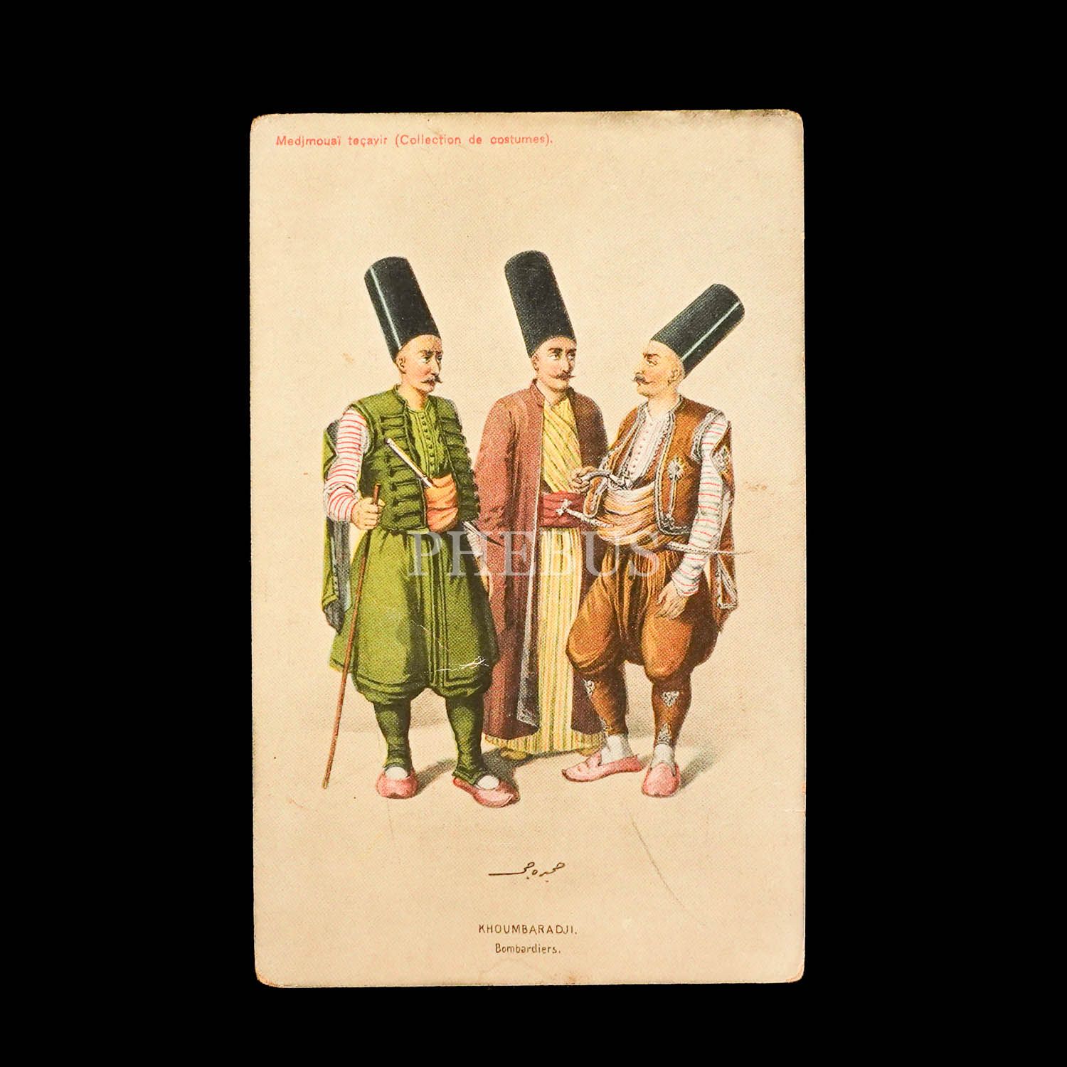 Türk kostümleri serisinden Kumbaracı ve maiyeti kartpostalı, "Medjmouai teçayir (Collection de costumes) - Khoumbaradji - Bombardiers", ed. Max Fruchtermann, Constantinople...