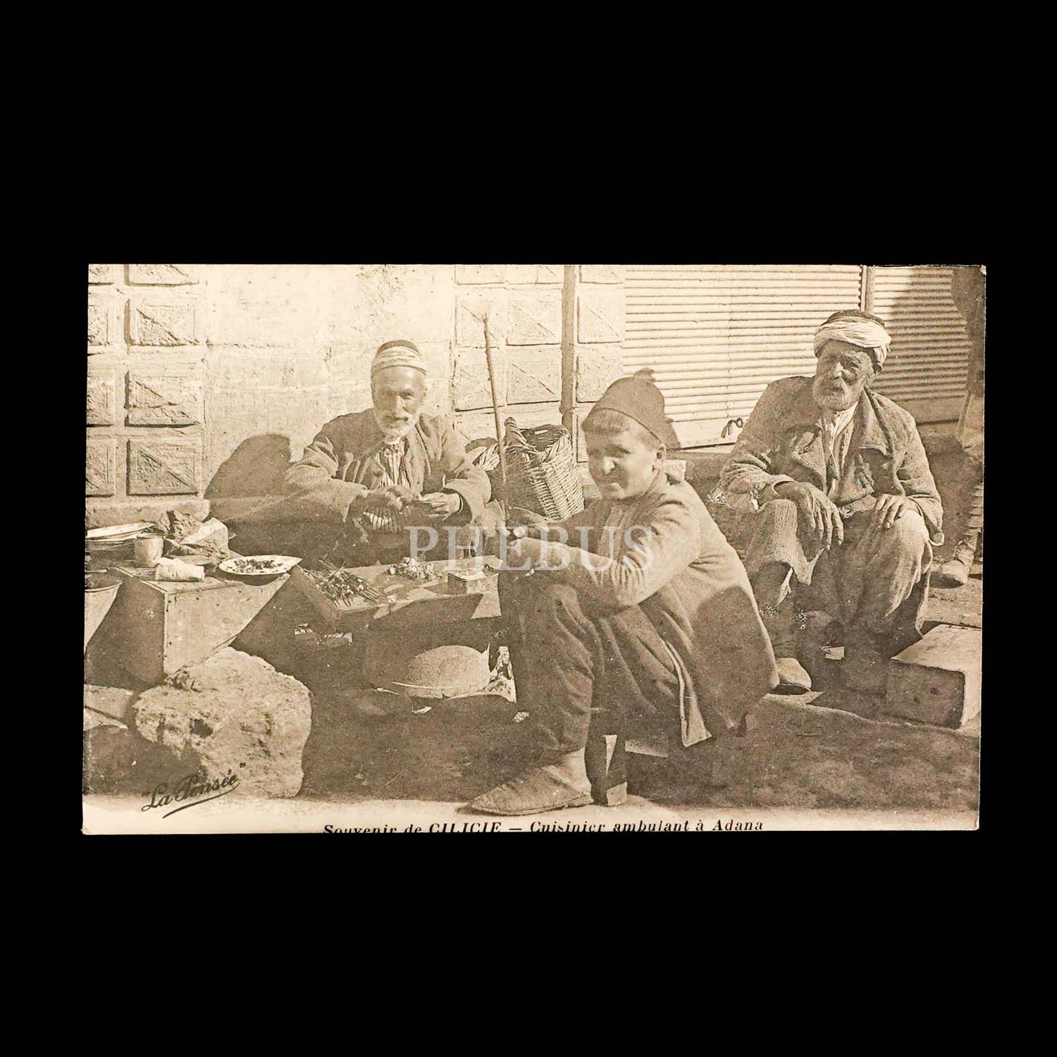Adanalı bir sokak yemekçisi ve müşterileri, "Souvenir de Cilicie - Cuisinier ambulant a Adana", ed. K. Papadopoulos et Fils Librairie Internationale, Mersine et Adana...