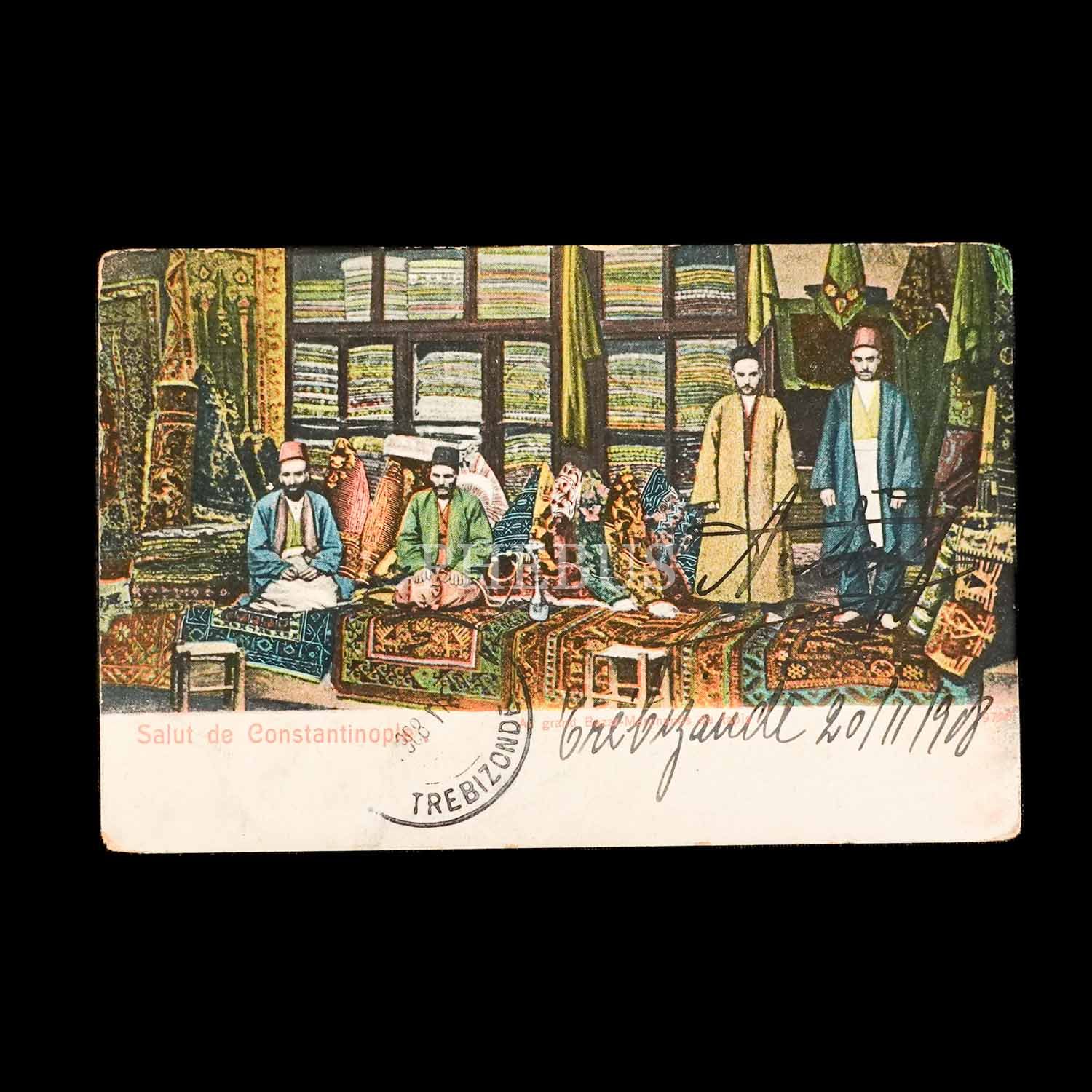 Kapalıçarşı´dan bir halı mağazası, "Salut de Constantinople - Au grand Bazar Marchands de tapis"...