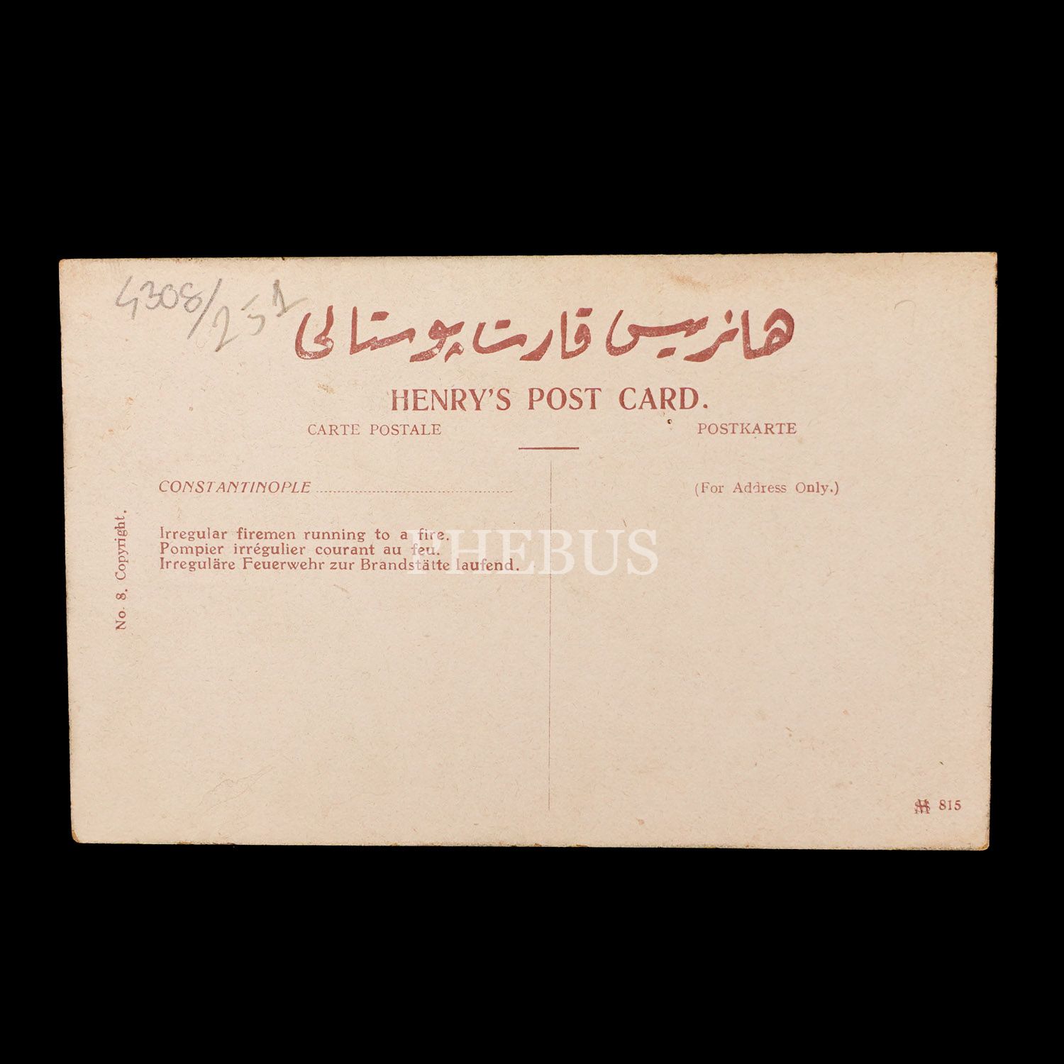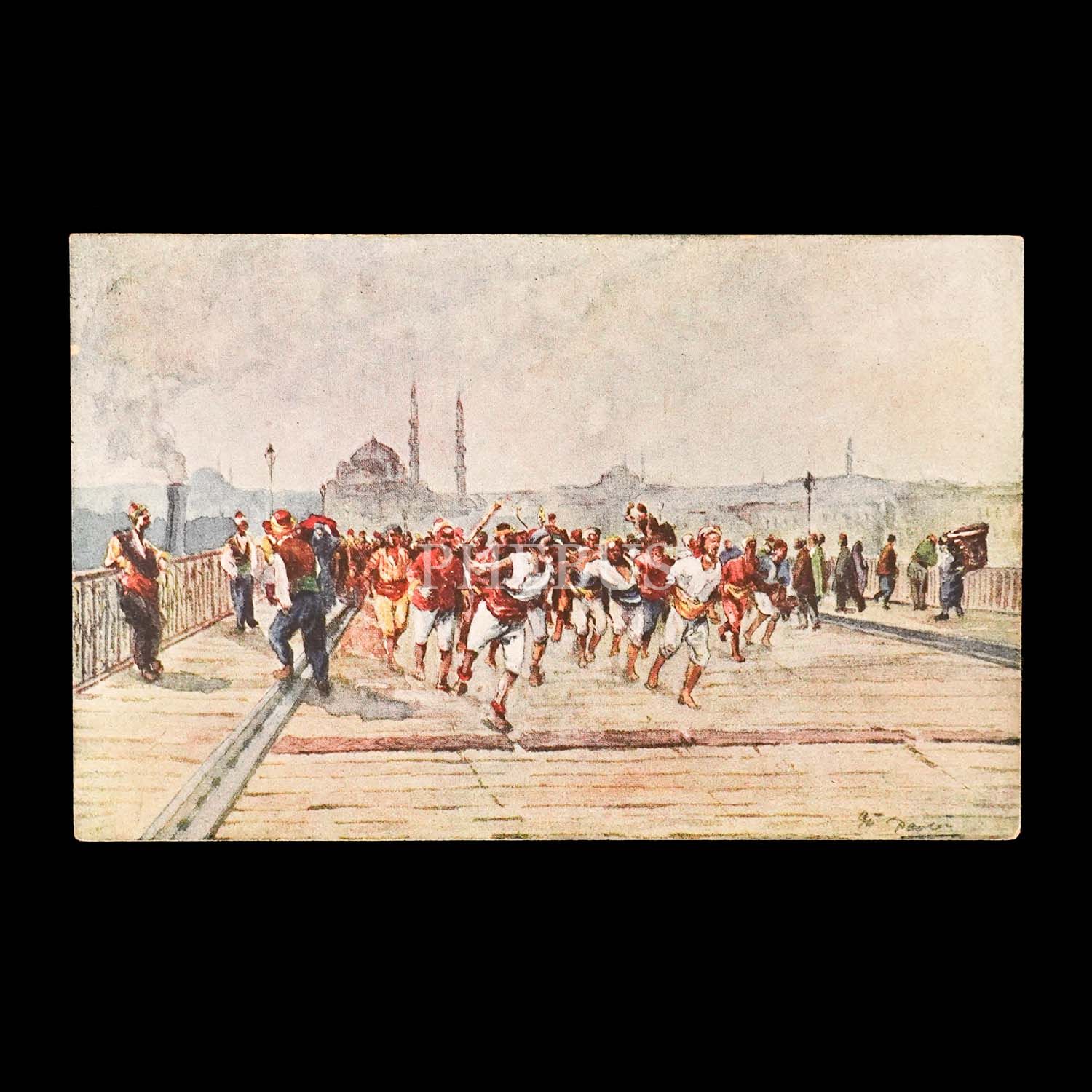 Ahşap Galata Köprüsü üzerinde yangına koşan tulumbacılar, "Irregular firemen running to a fire", ed. Henry´s Post Card...