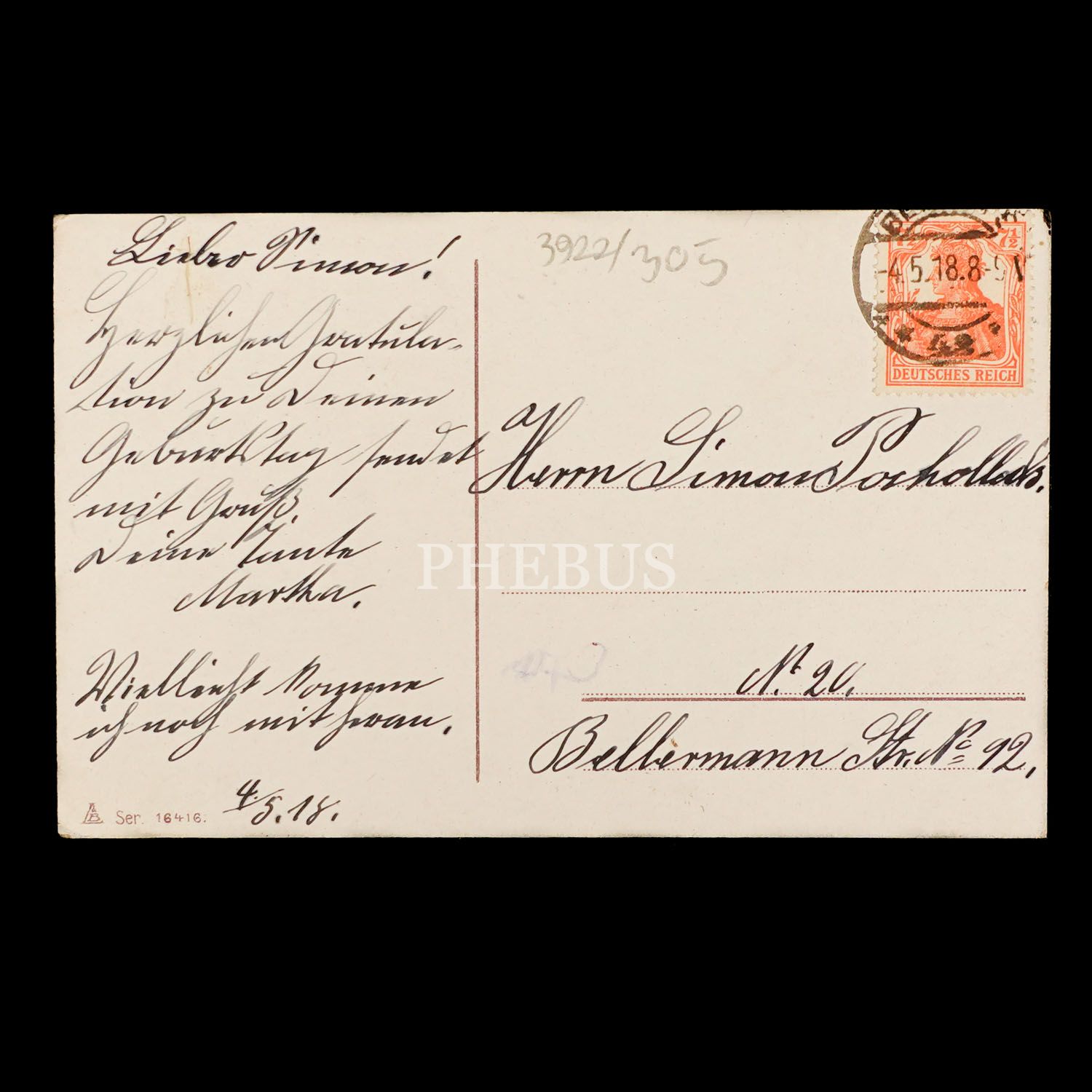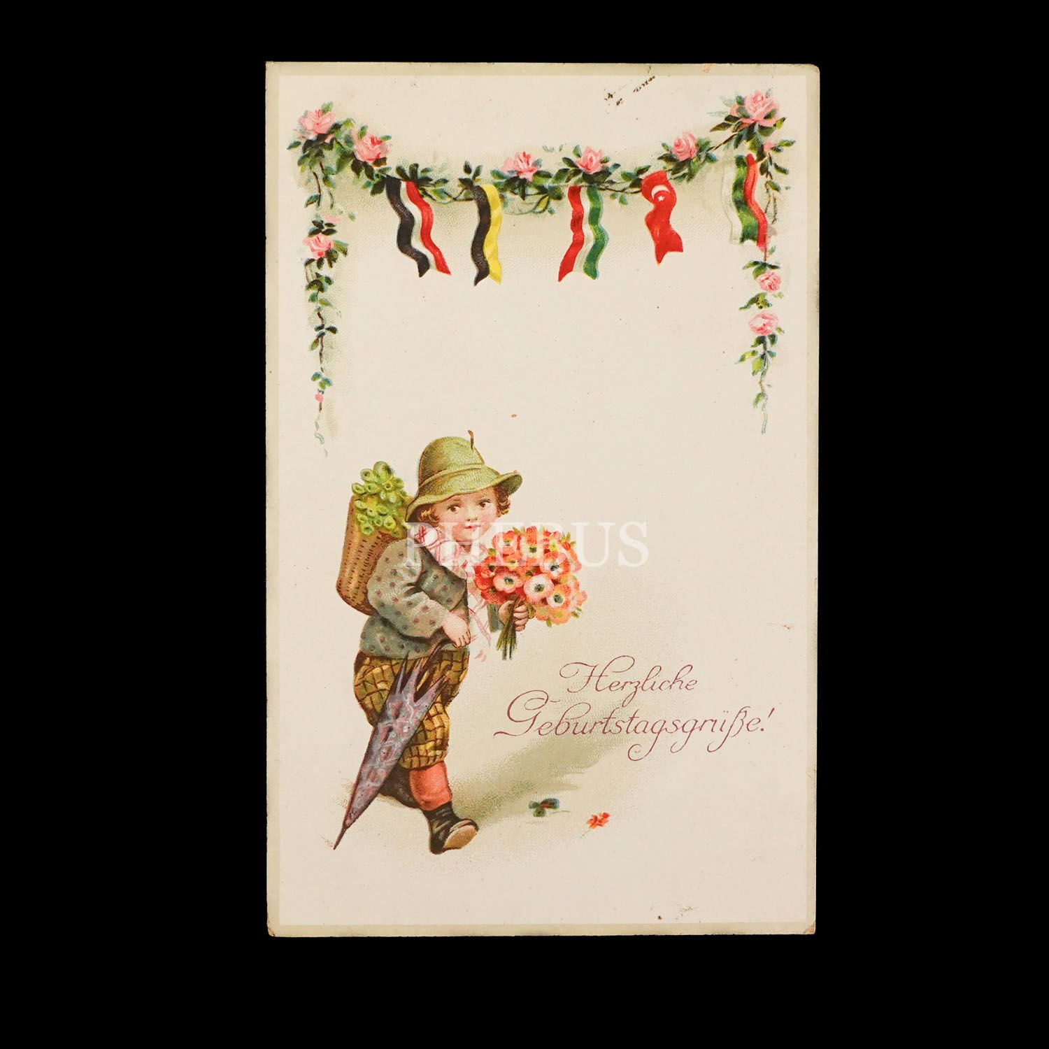 İttifak devletlerinin bayrakları ve elinde çiçek buketiyle küçük bir çocuk görselli kartpostal...