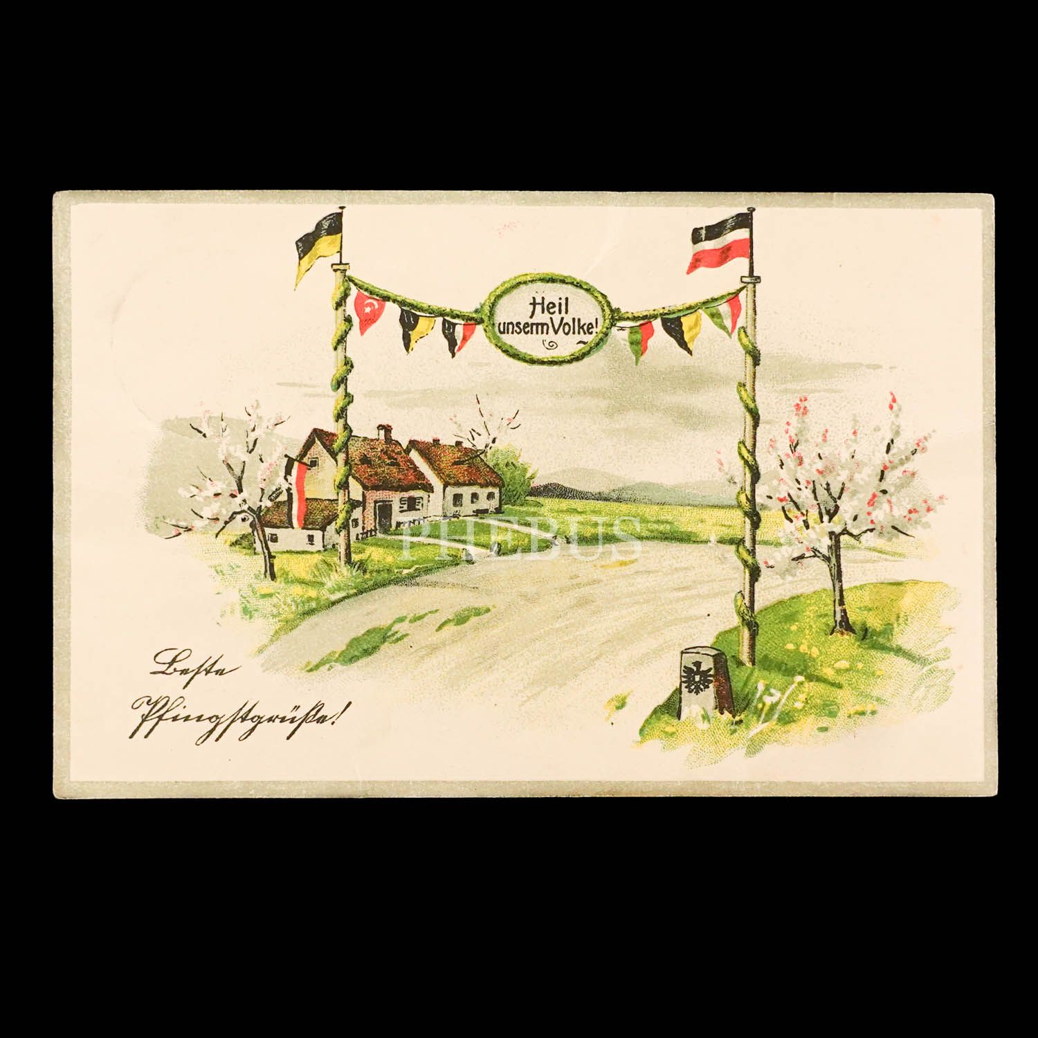 Üzeri Almanca "Heil unserm Volke!" (Halkımıza selam olsun!)" yazılı ve İttifak devletlerinin bayraklarıyla süslü tak görselli kartpostal...