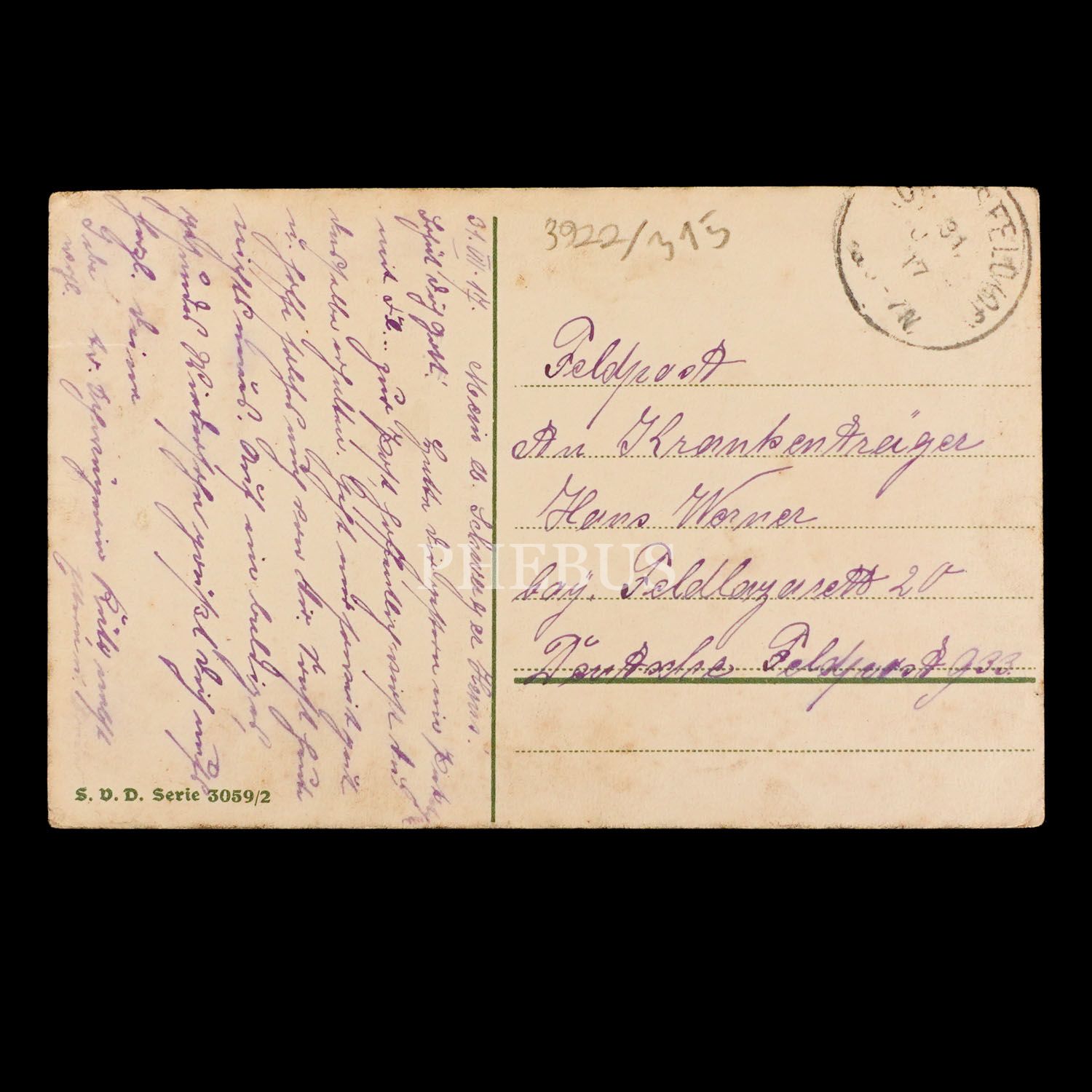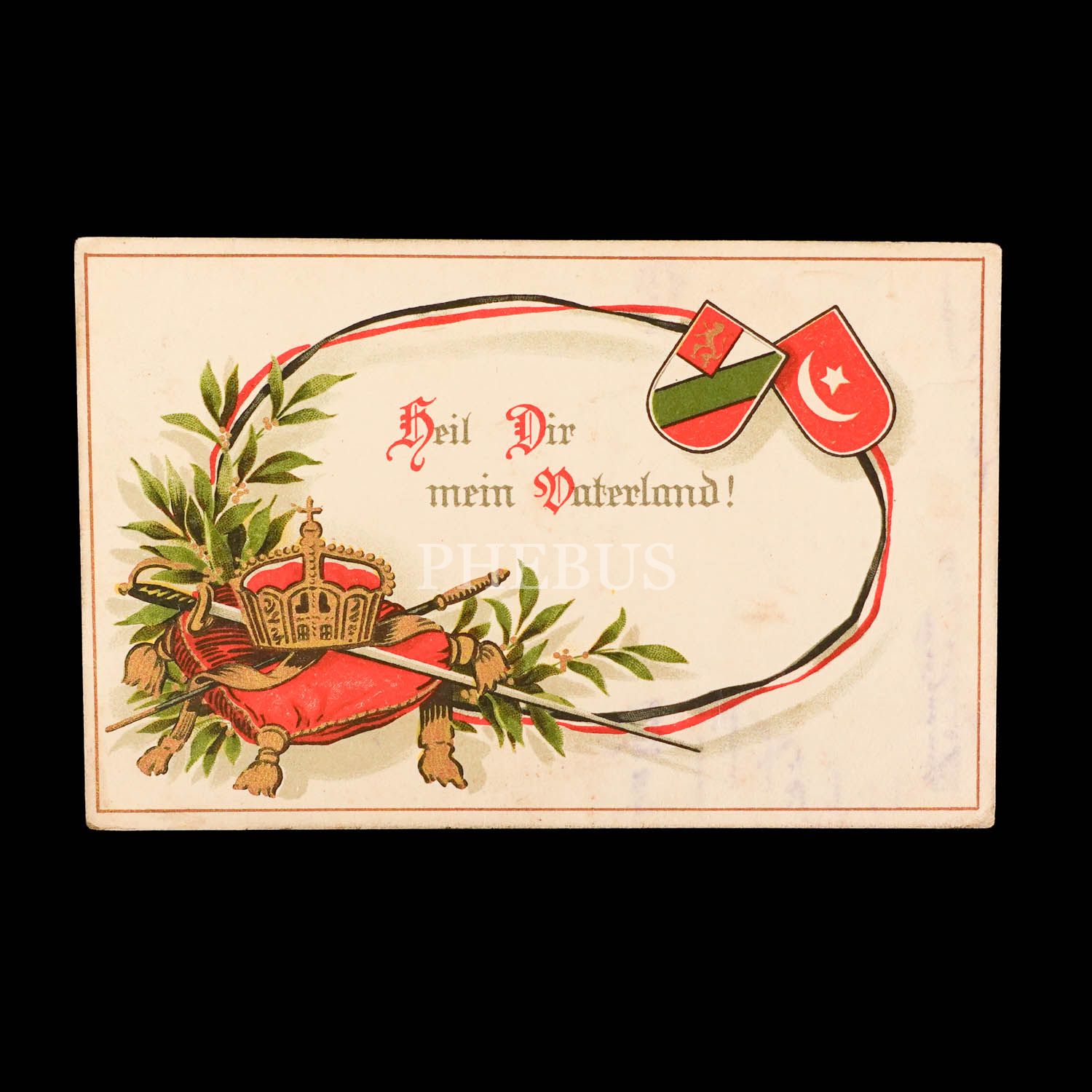 İttifak devletlerinin armaları ve kraliyet tacı görselli, Almanca "Heil Dir mein Vaterland!" (Selam Vatanım!) başlıklı kartpostal...