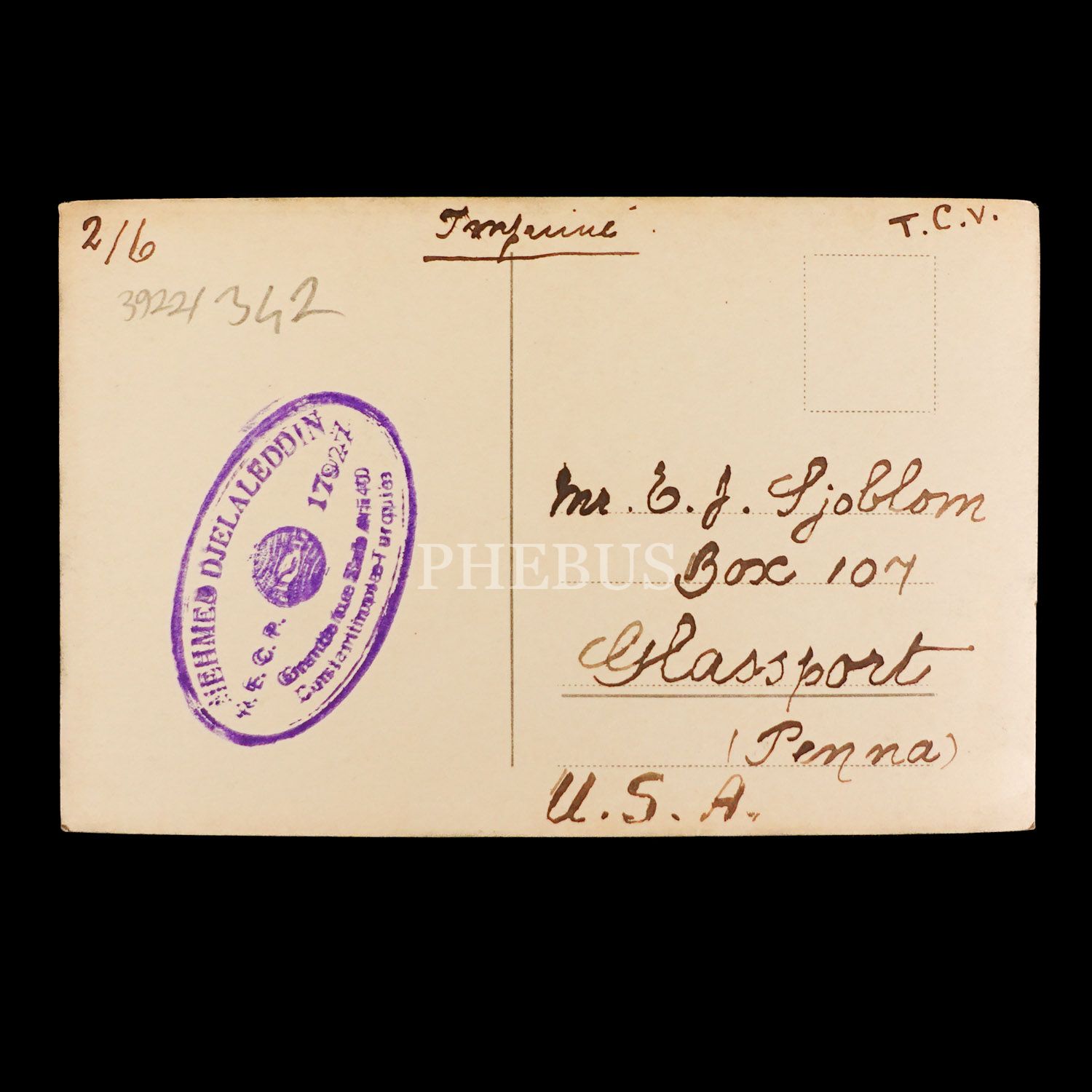 Postadan geçmiş. Kartın arka yüzünde "Mehmed Djelaleddin - Constantinople" kaşesi yer almaktadır.