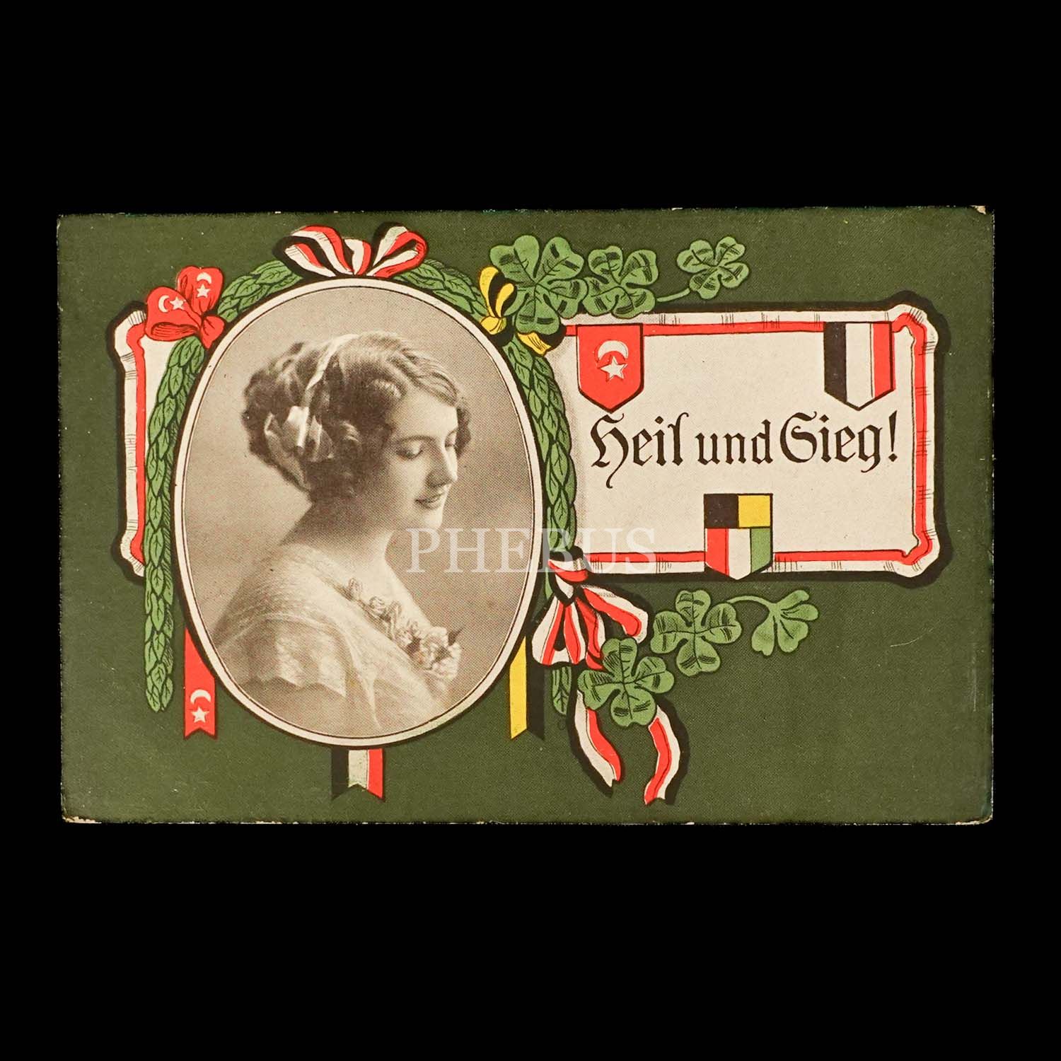 Alman kadını ve İttifak devletlerinin armaları görselli, Almanca "Heil und Sieg!" (Selam ve Zafer!) başlıklı kartpostal...