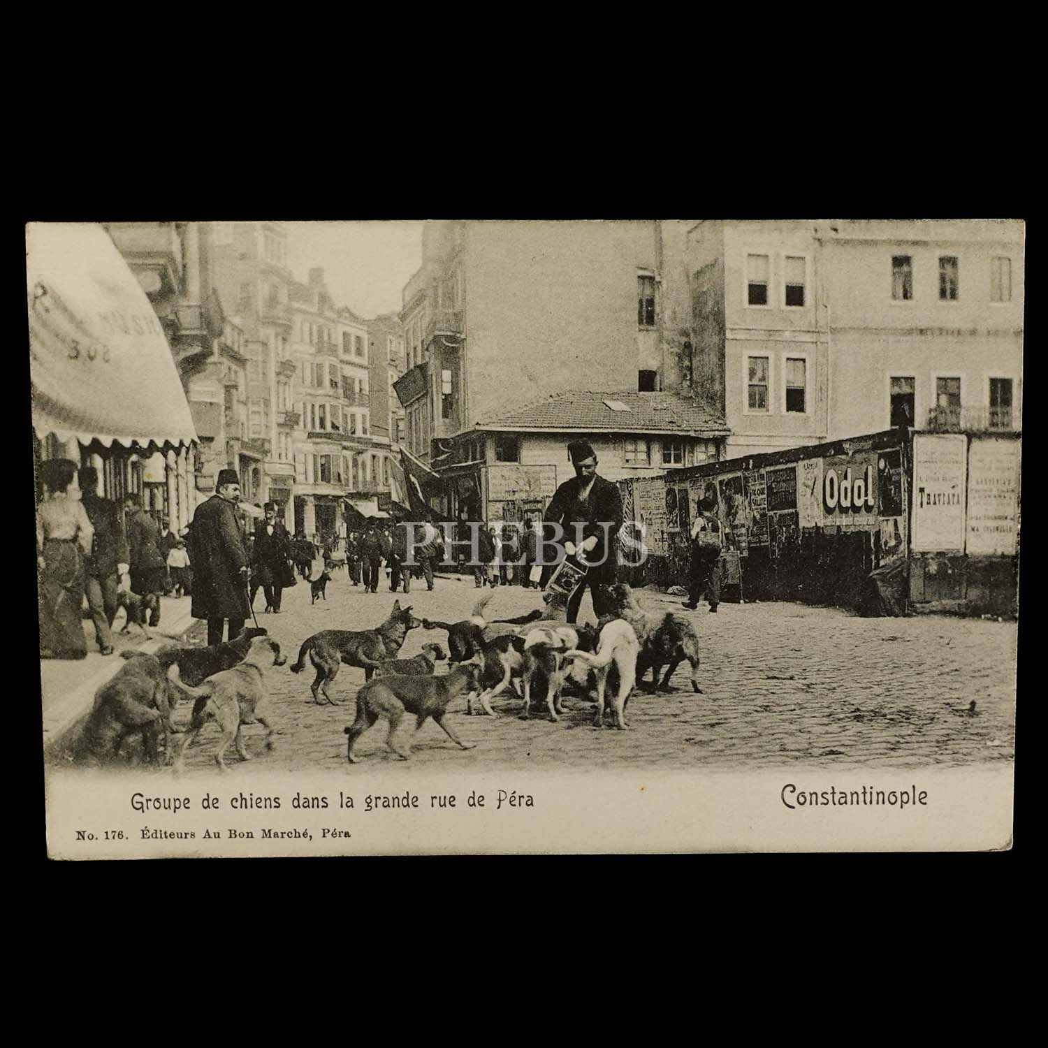 Cadde-i Kebir´de (İstiklal Caddesi) sokak köpekleri, "Groupe de chiens dans la grande rue de Pera - Constantinople", ed. Au Bon Marche, Pera...
