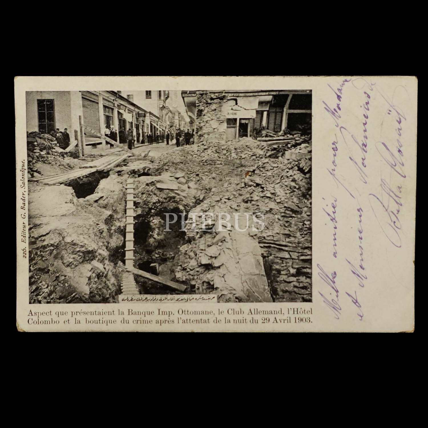 Postadan geçmiş. "Aspect que presentaient la Banque Imp. Ottomane, le Club Allemand, l´Hotel Colombo et la boutique du crime apres l´attentat de la nuit du 29 Avril 1903."